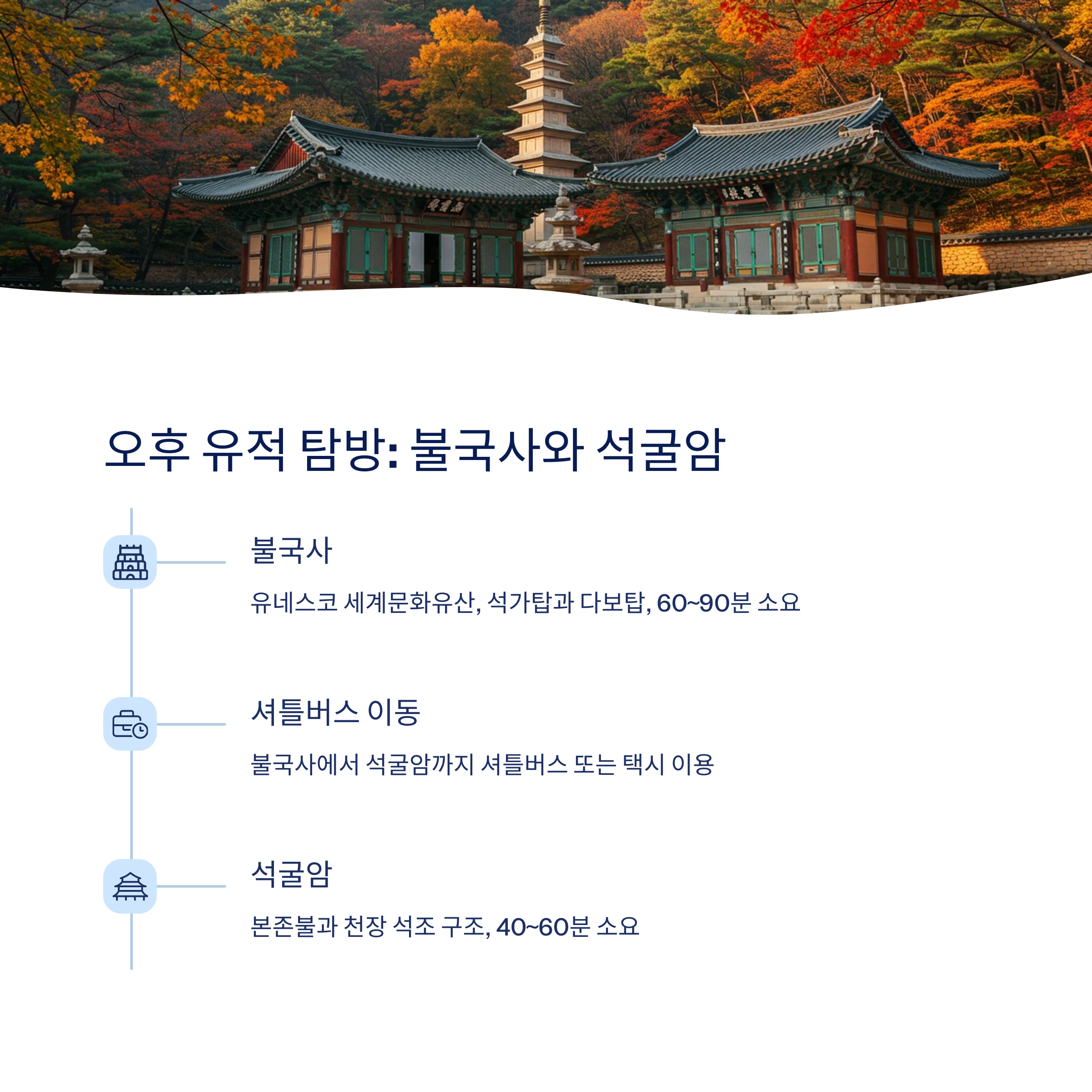 | 불국사 | 석가탑, 다보탑, 대웅전 | 60~90분 |