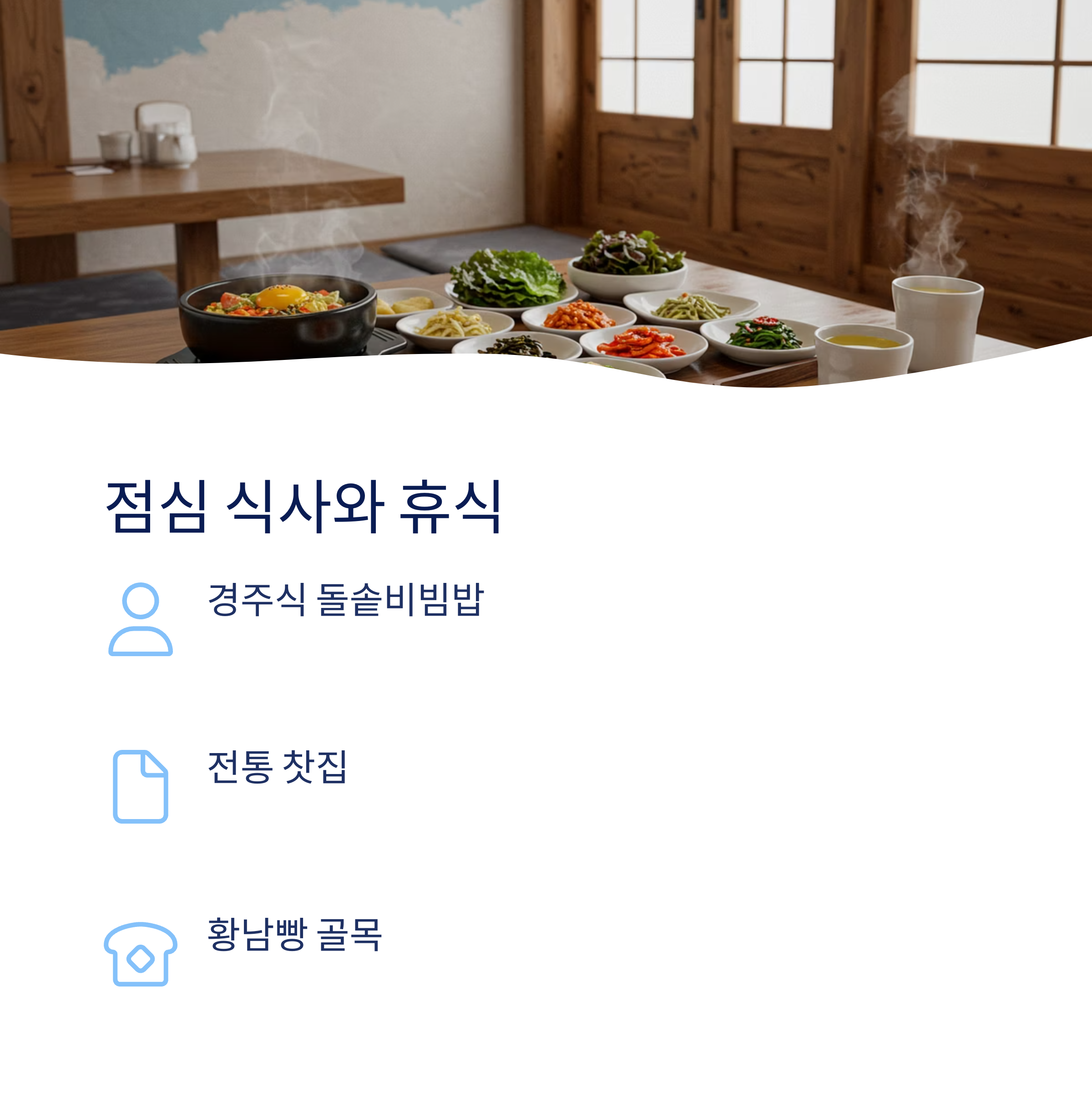 오전 일정을 마치고 점심은 경주 시내에서 한정식을 즐기는 걸 추천해요. 경주식 돌솥비빔밥이나 육회비빔밥이 유명하고, 카페 골목에 가면 아늑한 분위기의 티하우스들도 많아요. 잠깐 커피 한잔하면서 다음 일정을 정비하면 완벽한 리듬이 되죠.