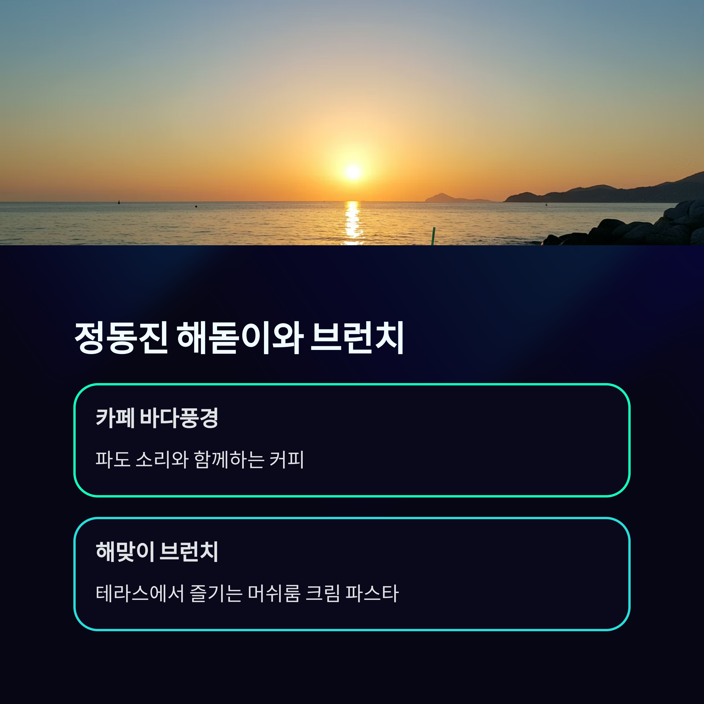 정동진 하면 해돋이잖아요? 저도 그 장관을 보고 싶어서 전날 밤 KTX에 올랐어요. 새벽에 도착해서 바닷가를 바라보다가, ‘카페 바다풍경’에 들어갔습니다. 이름 그대로, 파도 소리를 들으며 커피를 마실 수 있는 곳이에요. 아침 햇살이 테이블 위를 스치는데... 그냥 말이 안 돼요. 너무 아름다워서.
