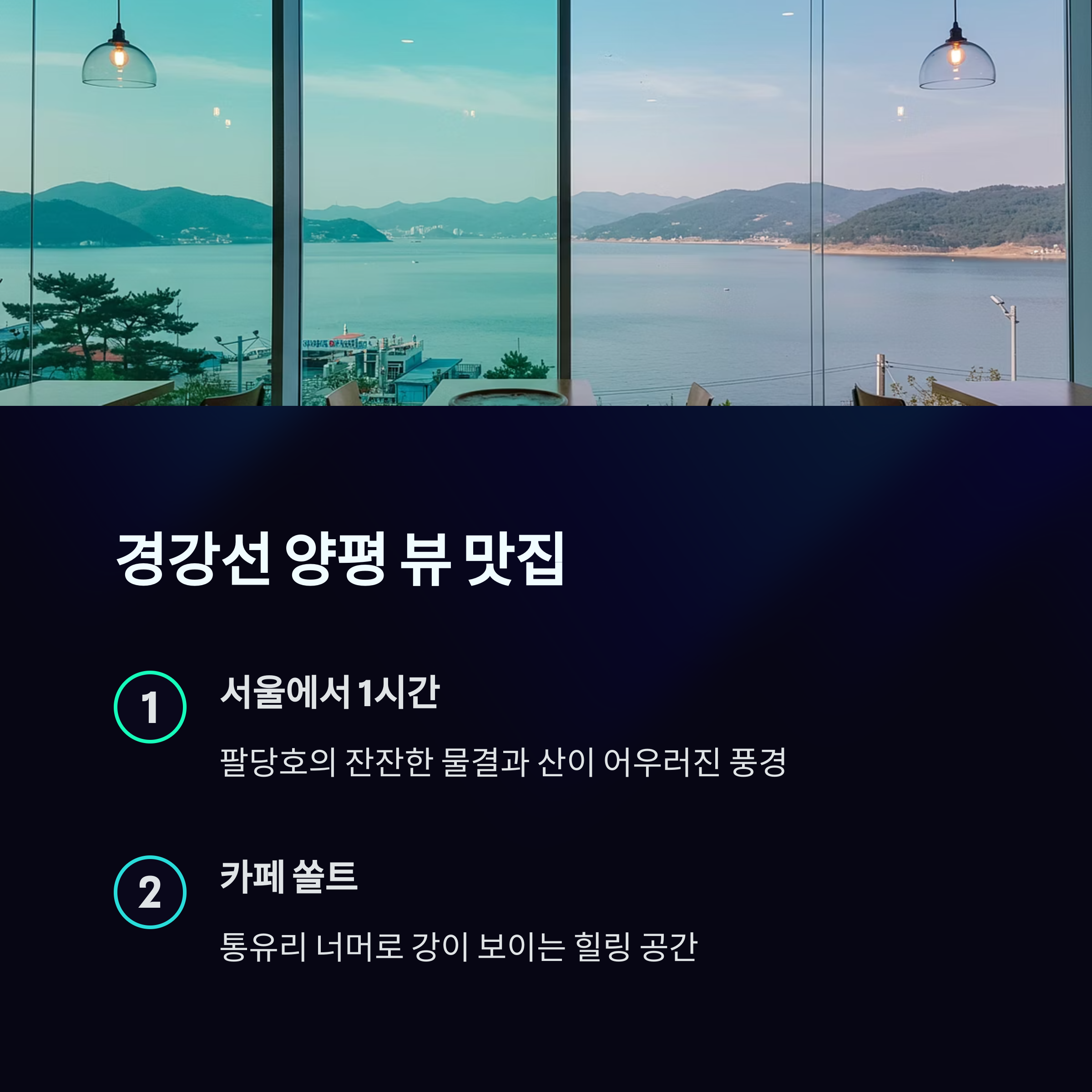 서울에서 기차로 1시간 남짓, 양평은 언제 가도 마음이 맑아지는 곳이죠. 경강선을 타고 도착하면, 팔당호의 잔잔한 물결이 펼쳐지고 산과 강이 어우러진 풍경이 영화처럼 스쳐갑니다. 그 풍경 한가운데, ‘카페 쏠트’ 같은 통유리 뷰 맛집에 앉아 있으면 시간이 멈춘 것 같더라고요. 창밖으로 강이 보이고, 커피 향이 코끝을 간질이는 그 순간, 진짜 힐링이 뭔지 알게 됩니다.