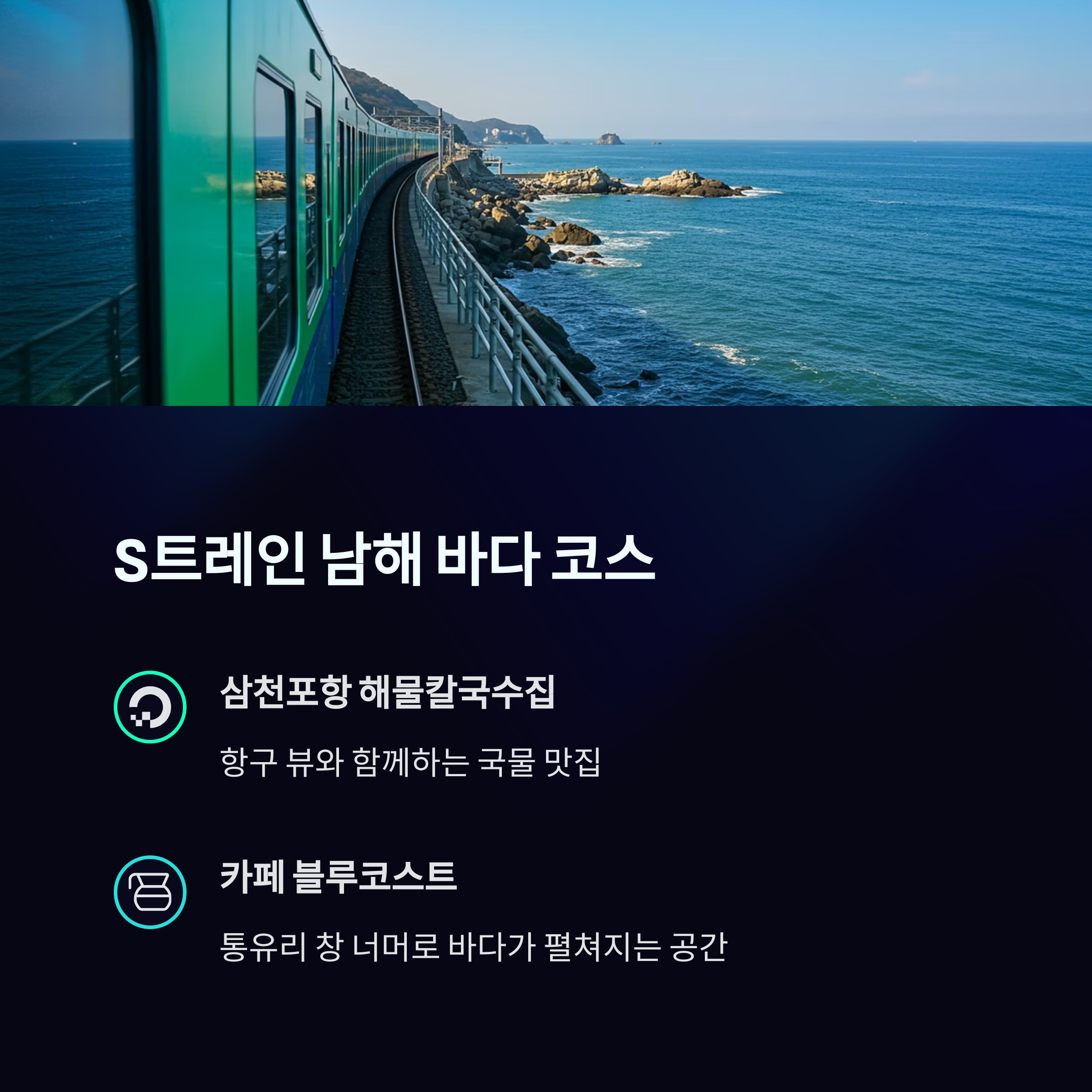 S트레인은 바다 옆을 달리는 로맨틱한 노선이에요. 통영, 삼천포 쪽을 따라 달리다 보면 ‘바다, 바다, 또 바다!’ 여행객의 눈은 물론 입도 즐거운 구간입니다. 특히 삼천포항에 내려서 먹는 해산물은 그냥 반칙이에요. 아래는 제가 실제로 들렀던 뷰 맛집 리스트입니다.