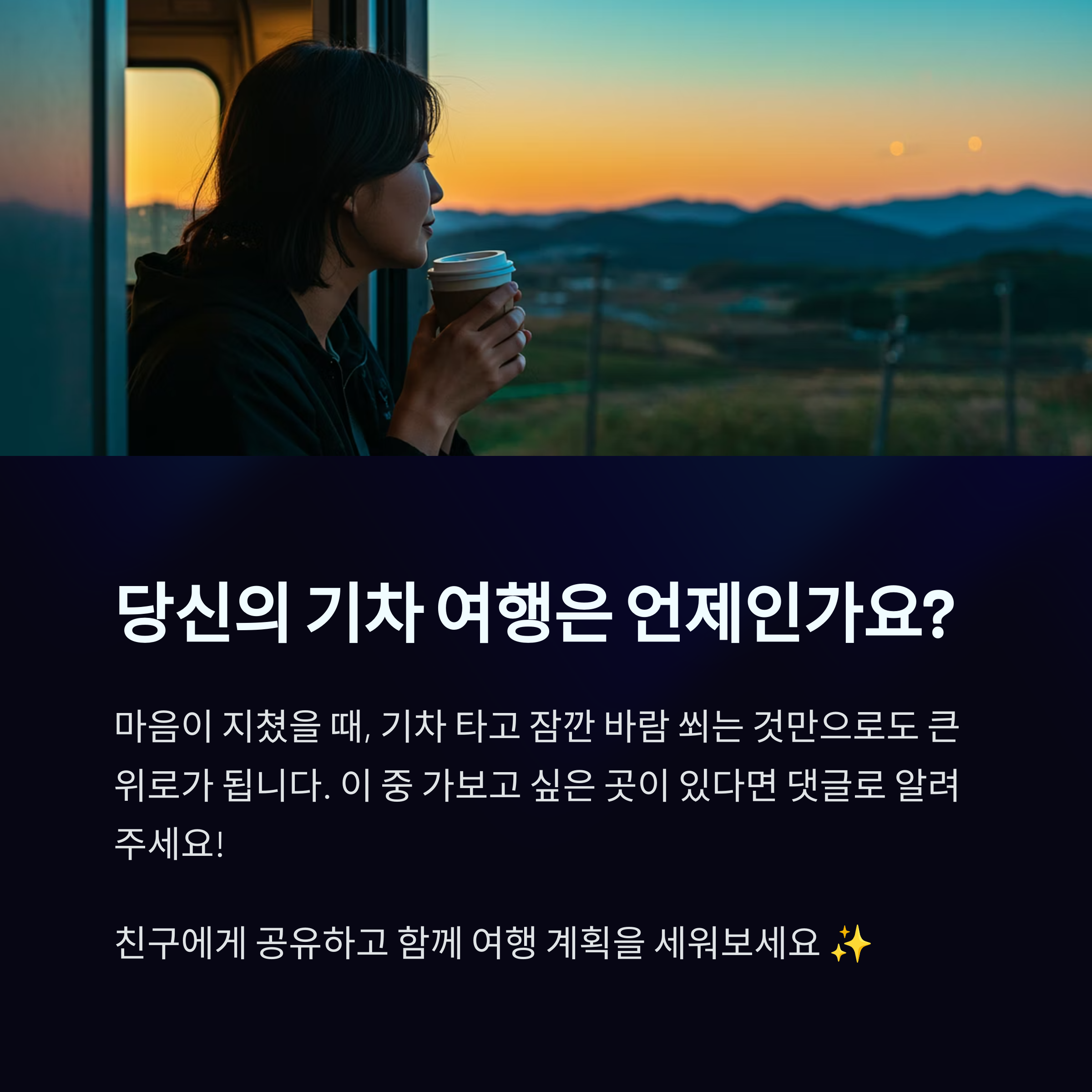 마음이 지쳤을 때, 먼 곳이 아니더라도 기차 타고 잠깐 바람 쐬는 것만으로도 큰 위로가 되잖아요. 창밖 풍경에 빠져들고, 한적한 카페에서 멍하니 시간을 보내는 그런 순간들. 이번 글이 여러분의 여행 욕구를 조금이라도 자극했길 바라요! 혹시 이 중에 다녀온 곳이 있다면, 아니면 가보고 싶은 코스가 있다면 댓글로 공유해 주세요. 우리 서로 여행 버킷리스트 업데이트해요 :)
