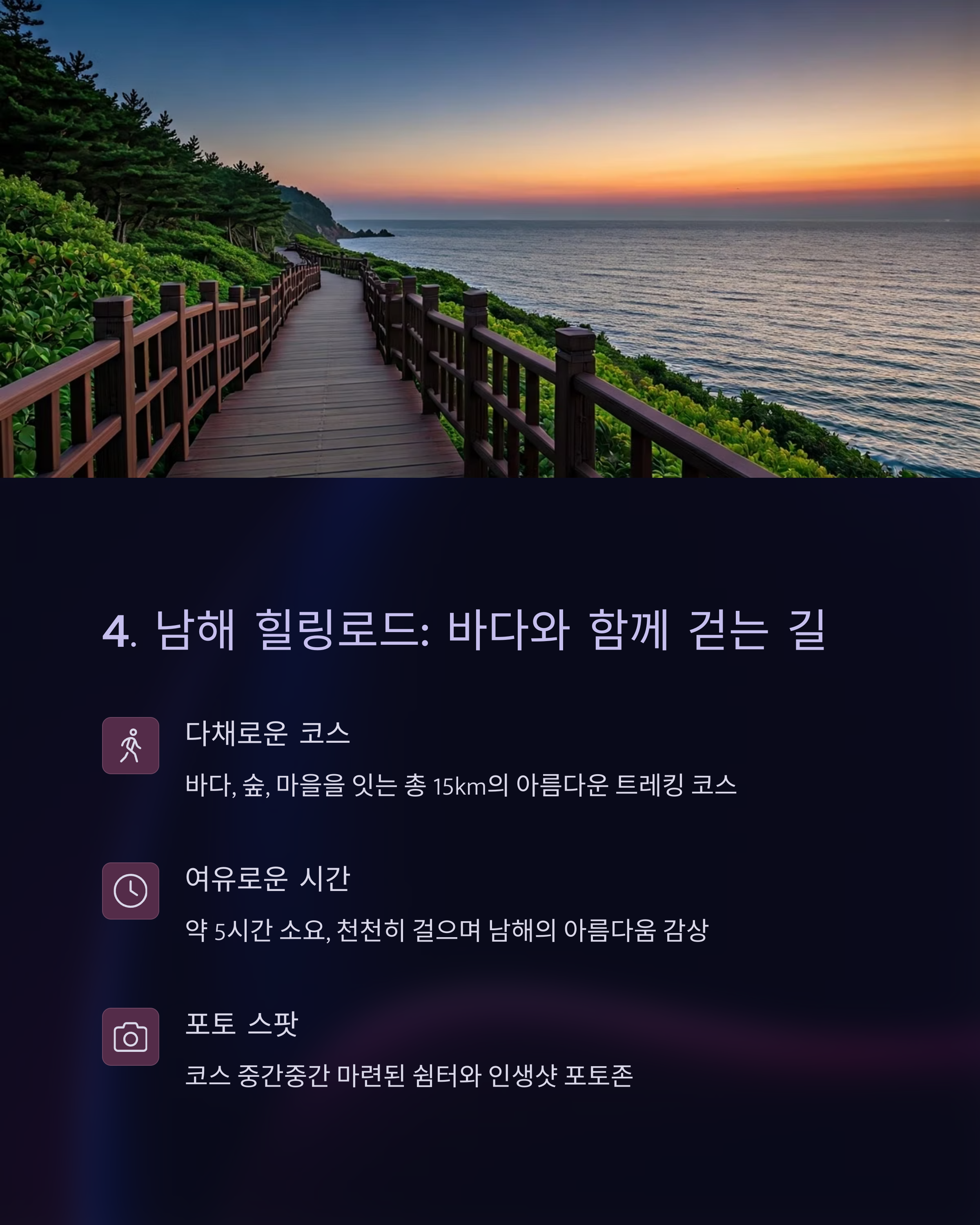남해에는 ‘느림’을 주제로 한 걷기 길이 많아요. 그중에서도 ‘남해 힐링로드’는 바다를 끼고 걷는 코스가 인상적이에요. 길을 따라 걷다 보면 바다 냄새, 풀잎 흔들리는 소리, 발밑에서 자잘한 자갈 밟히는 촉감까지 모두가 감각을 깨워주는 힐링 요소가 되죠. 카페 하나 없이, 간판도 없이 이어지는 조용한 이 길에서 나는 내 속도를 되찾았어요.