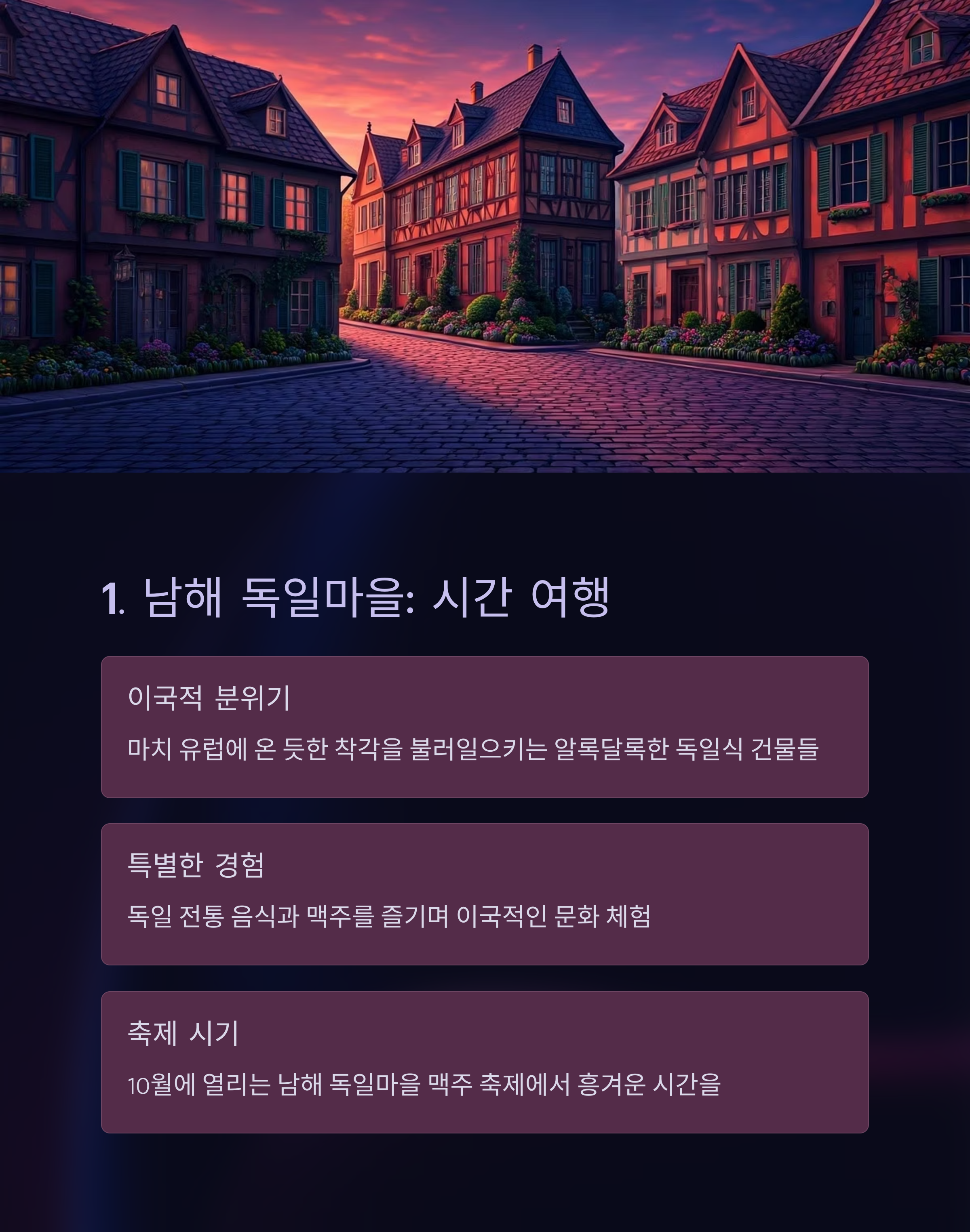 남해 독일마을에 들어서는 순간, 마치 유럽의 한 마을로 순간이동 한 듯한 기분이 들어요. 붉은 지붕과 하얀 벽의 이국적인 건물들이 줄지어 서 있고, 그 너머로는 푸른 바다가 펼쳐져 있죠. 이곳은 1960~70년대에 독일로 간 파독 간호사와 광부들이 귀국 후 정착한 마을로, 그들의 삶과 이야기가 고스란히 담겨 있어요. 걷기만 해도 조용한 분위기 속에서 위로받는 느낌이 들죠. 특히 오후 늦게 해질 무렵, 마을 언덕에서 바라보는 남해 바다 풍경은 잊을 수 없답니다.