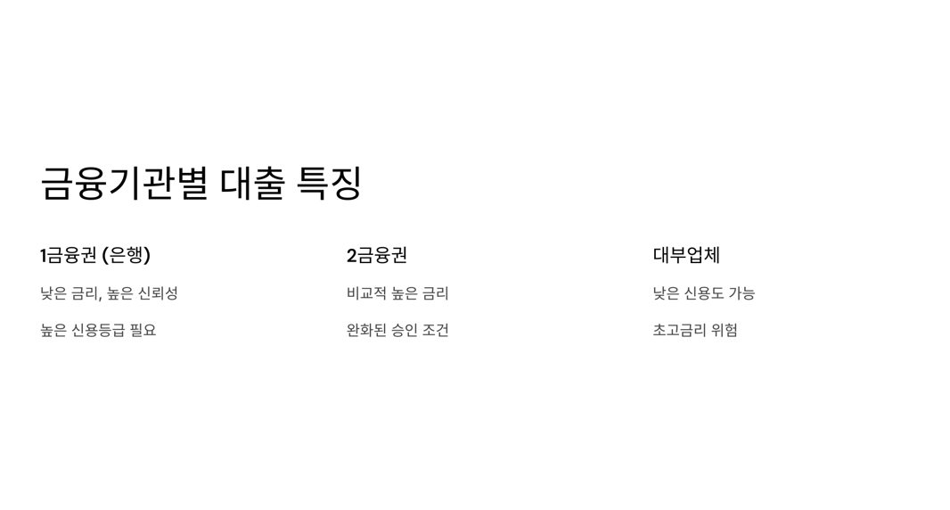 - 1금융권(은행): 낮은 금리와 신뢰성을 보장하지만, 신용등급이 높아야 승인 가능