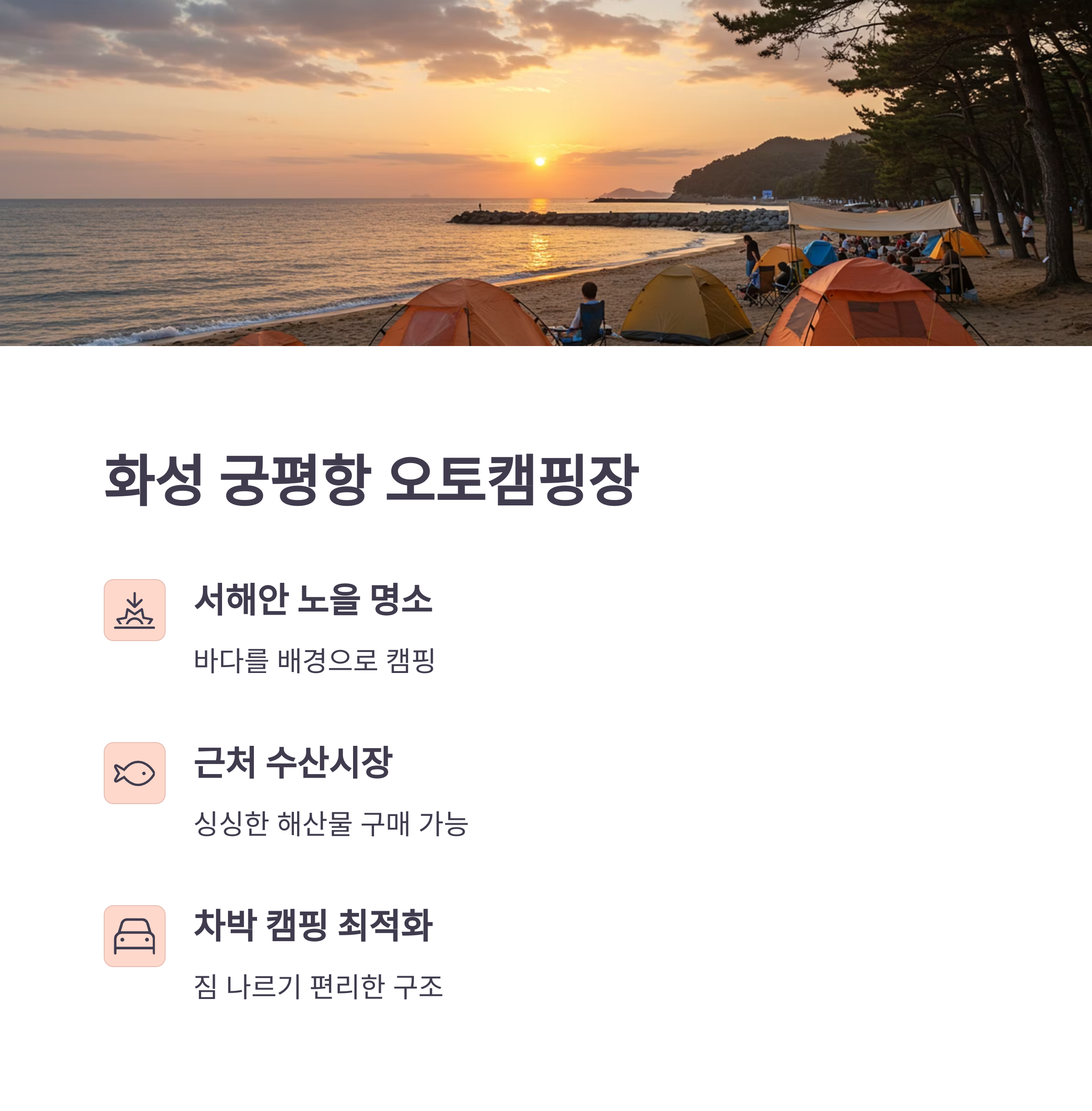 바다를 보며 캠핑하고 싶다면 이곳만큼 좋은 데가 없어요. 화성 궁평항 오토캠핑장은 서해안 바다를 배경으로 노을 맛집이기도 해요. 캠핑 후엔 근처 수산시장에서 싱싱한 회를 사다가 먹는 것도 별미고요. 아이들 뛰어놀 공간도 넉넉하고, 차 옆에 텐트를 칠 수 있어서 짐 나르기도 편하답니다.