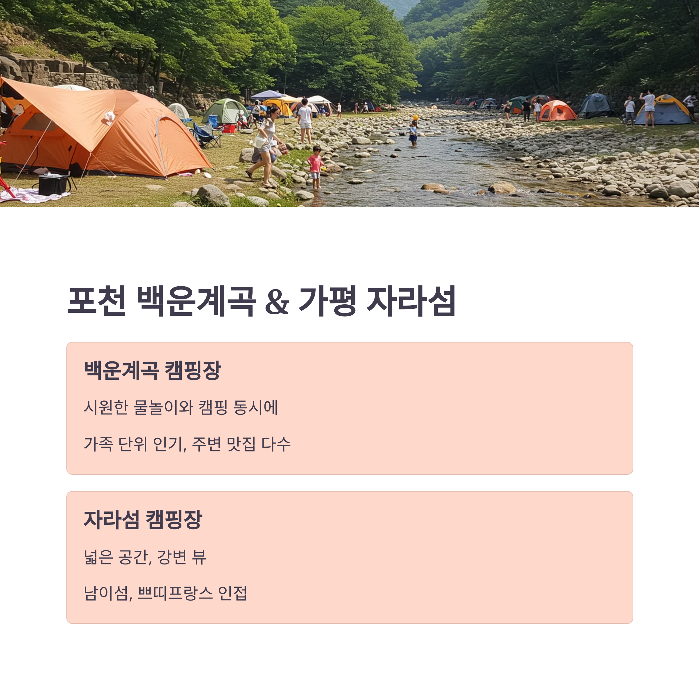 더운 여름엔 역시 계곡이 최고죠! 포천 백운계곡 캠핑장은 시원한 물놀이와 캠핑을 동시에 즐길 수 있는 대표적인 명소예요. 아이들과 함께 물장구치며 놀 수 있어서 특히 가족들에게 인기고요. 근처엔 맛집도 많아서 캠핑과 미식여행을 동시에 할 수 있는 기회이기도 해요.