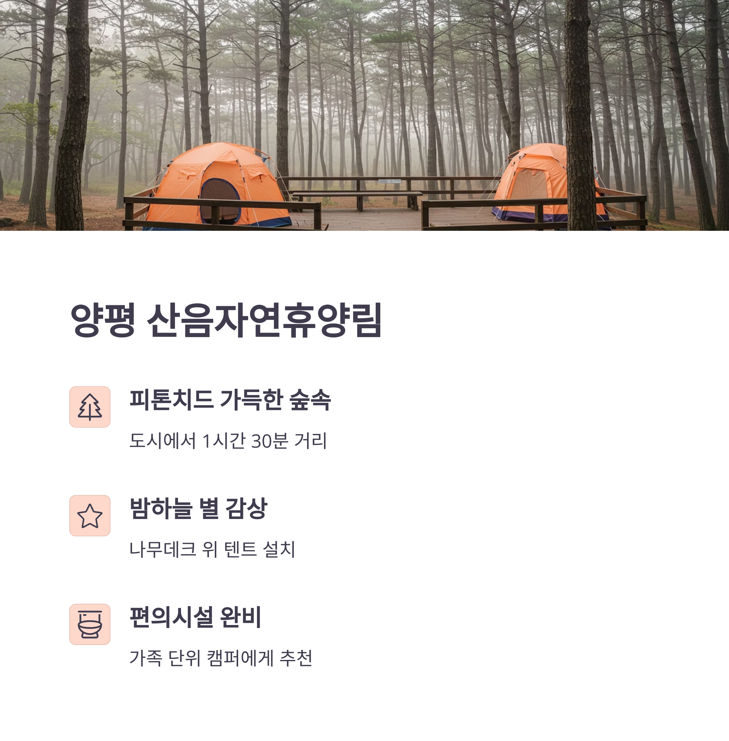 양평에 있는 산음자연휴양림은 그야말로 ‘자연 그 자체’입니다. 도시에서 차로 1시간 반이면 도착하는 이곳은 깊은 숲속에 있어 피톤치드가 마구 쏟아지는 느낌이에요. 나무데크 위에서 텐트 치고, 아침엔 새소리에 눈을 뜨고, 밤엔 별이 수놓은 하늘을 감상할 수 있어요. 화장실이나 샤워실 등 편의 시설도 꽤 잘 되어 있어서 가족 단위 캠퍼들에게도 추천하고 싶은 곳이죠.