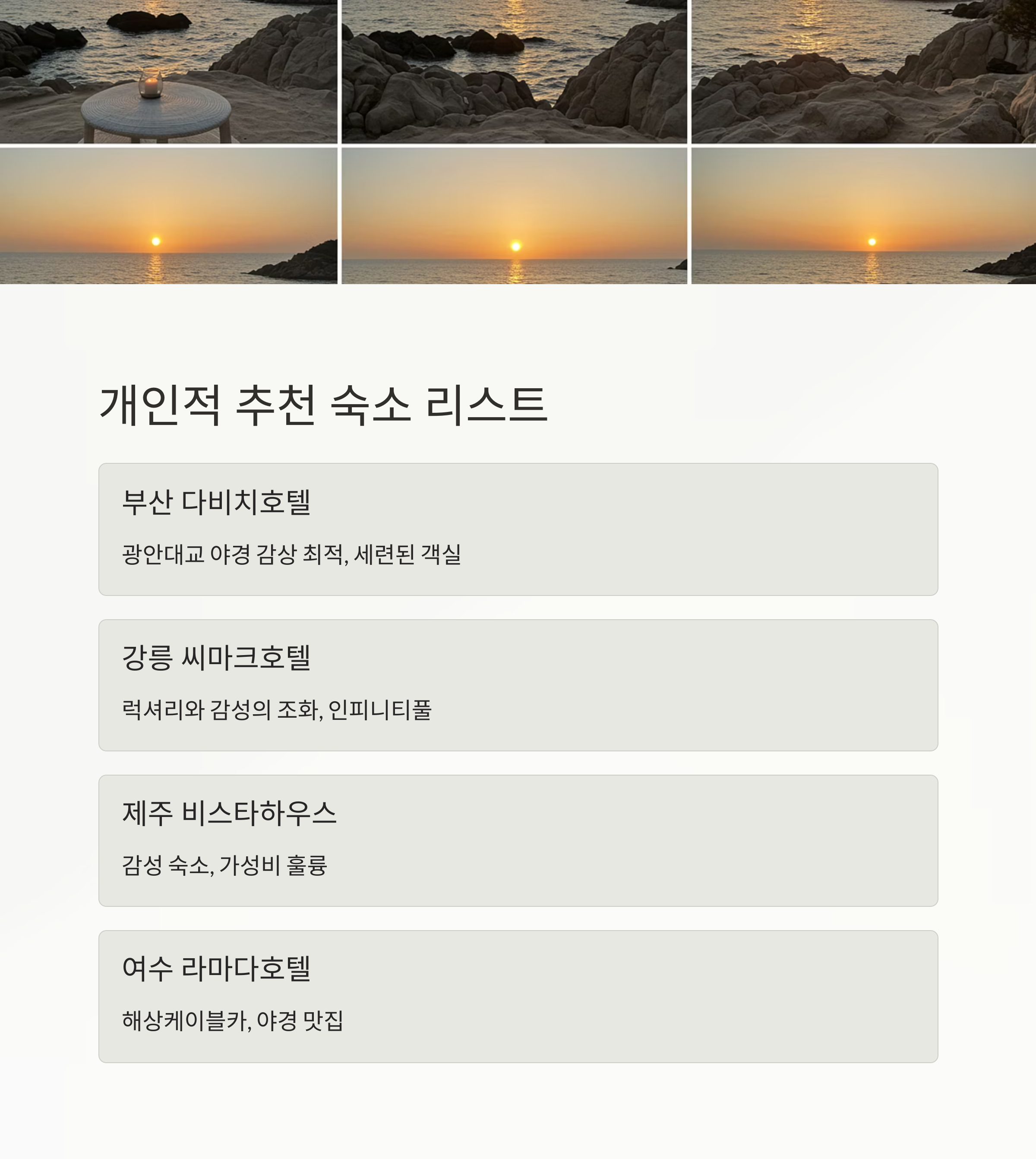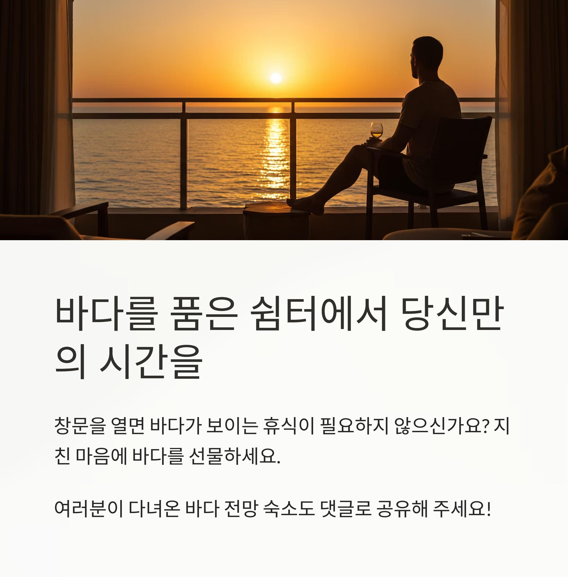 지금 이 순간, 창문을 열면 바다가 보이는 그런 휴식이 필요하지 않으신가요? 바쁜 일상에 지치고 마음이 고단할 때, 그저 멍하니 바다를 바라보는 것만으로도 치유받을 수 있다는 걸 저도 이번 여행을 통해 다시 느꼈어요. 여러분도 꼭 한 번, '바다를 품은 쉼터'에서 자신만의 시간을 가져보시길 바라요. 댓글로 여러분이 다녀온 바다 전망 숙소도 공유해 주세요! 서로 좋은 정보 나누는 공간이 되면 좋겠어요 :)