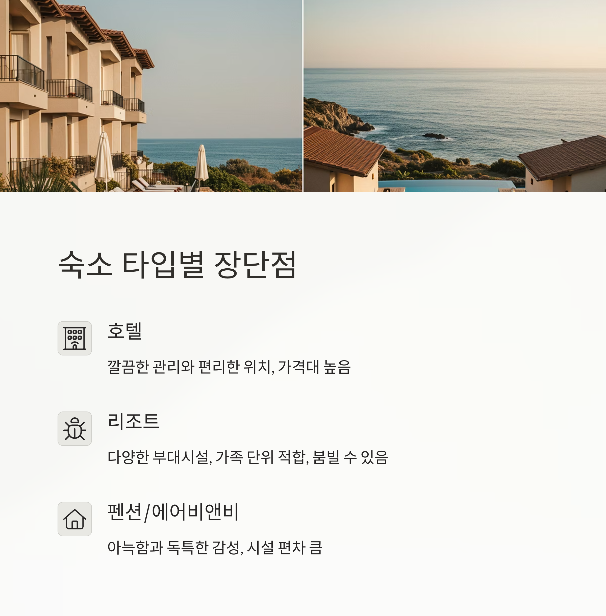 • 리조트: 다양한 부대시설과 가족 단위에 적합, 다소 붐빌 수 있음