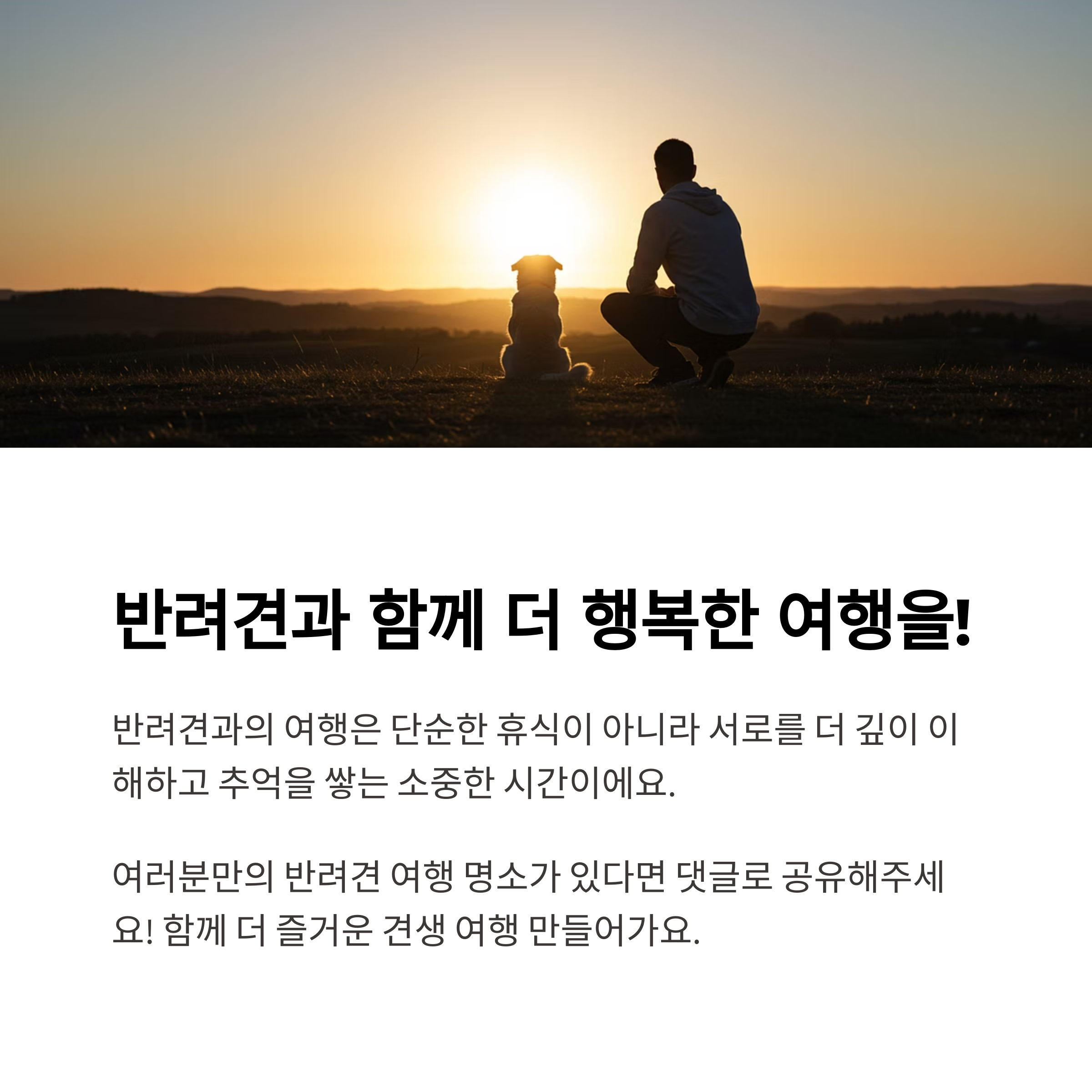 여행은 사람만을 위한 게 아니죠. 반려견과의 여행은 단순한 휴식이 아니라, 서로를 더 깊이 이해하고 추억을 쌓을 수 있는 소중한 시간이에요. 앞으로도 콩이와 함께 전국 방방곡곡을 누비며 좋은 곳들 소개해드릴게요. 혹시 여러분만의 반려견 여행 명소가 있다면 댓글로 공유해주세요! 함께 더 즐거운 견생 여행 만들어가요 :)