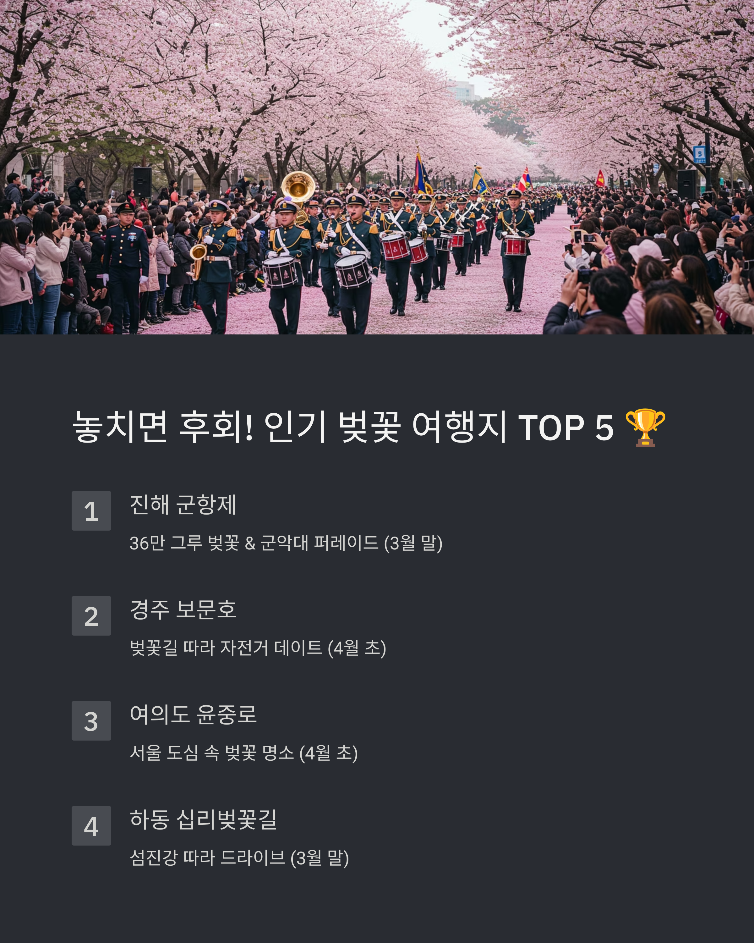 매년 SNS를 뜨겁게 달구는 벚꽃 명소들이 있죠. 진해 군항제는 말할 것도 없고, 여의도 윤중로, 경주의 보문호, 섬진강 기차 마을까지. 그중에서도 특히 풍경, 접근성, 인생샷 포인트로 따져봤을 때 많은 이들이 찾는 TOP 5를 정리해봤어요.