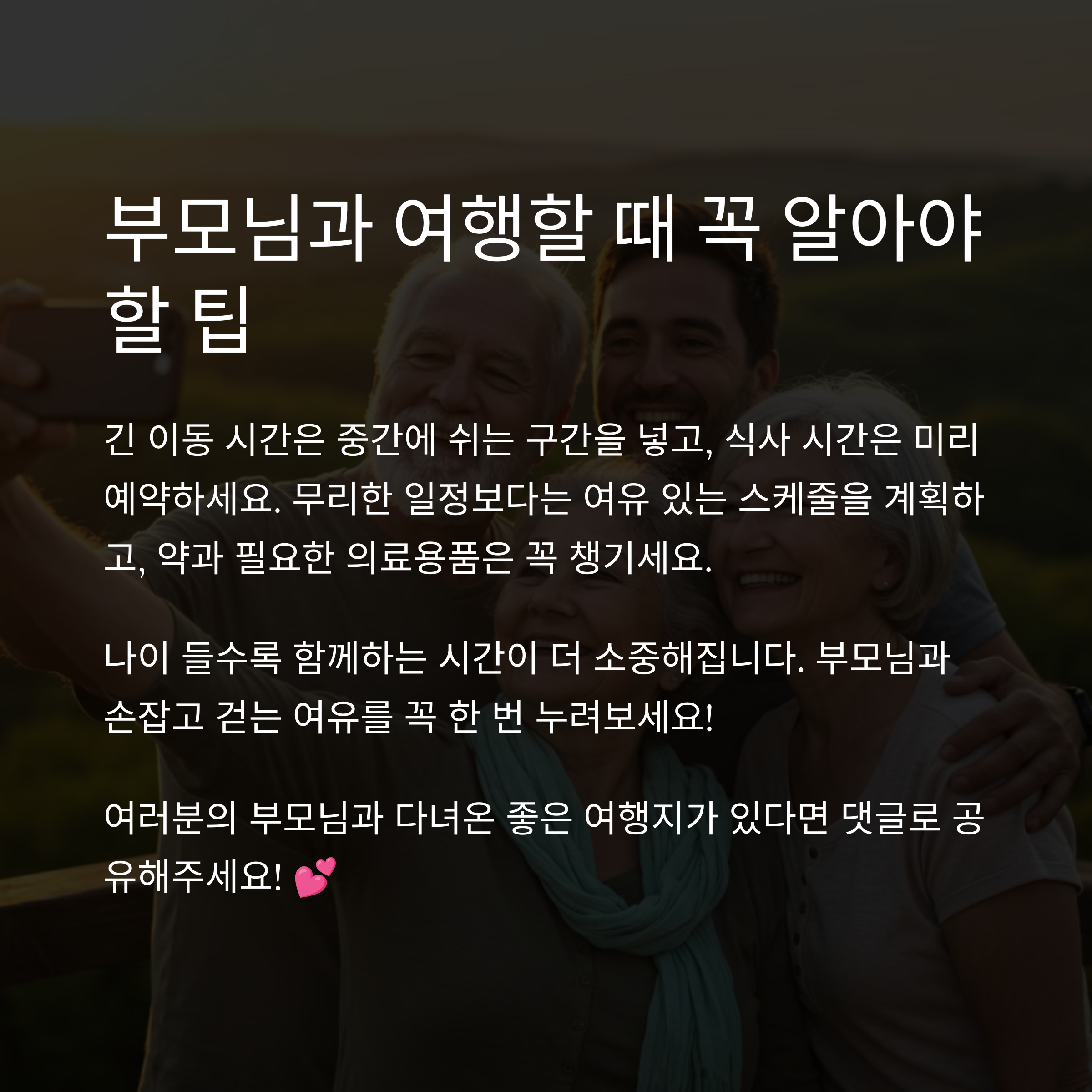 이번 글이 부모님과의 소중한 시간을 더 의미 있게 만들어주는 데 도움이 되었길 바라요. 나이 들수록 함께하는 시간이 점점 더 소중해지잖아요. 바쁜 일상 속에서도 잠시 멈춰서, 부모님과 손잡고 걷는 그 여유를 꼭 한 번 누려보시길 진심으로 추천드려요. 혹시 다녀오신 곳 중에 좋았던 여행지가 있다면 댓글로도 공유해주세요! 😊