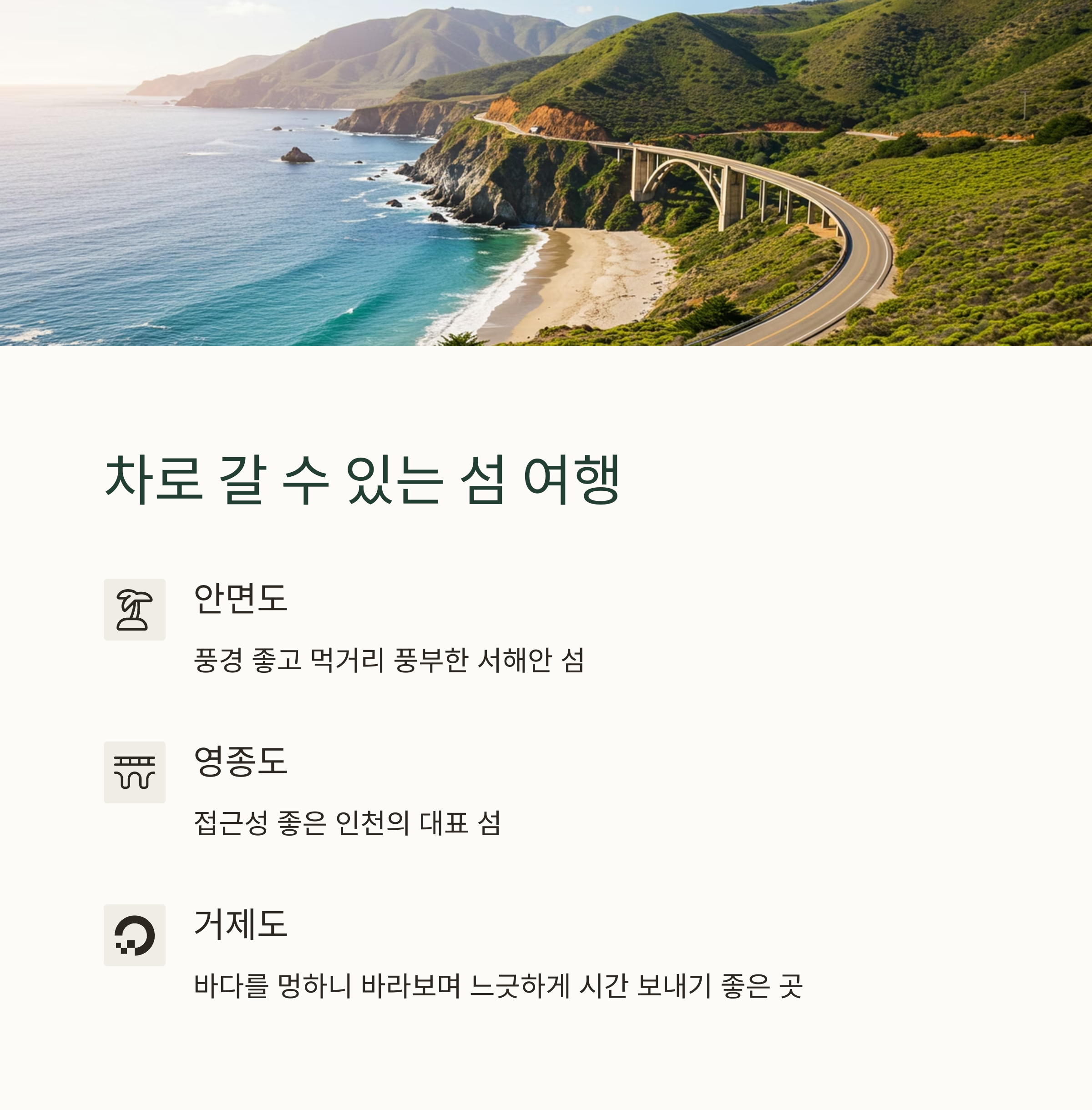 배 타는 여행, 부모님이 힘들어하실까 걱정된다면, 다리로 연결된 섬부터 시작해보세요. 요즘은 차량으로 쉽게 접근할 수 있는 섬이 많아서 훨씬 편해졌어요. 안면도, 영종도, 거제도는 풍경 좋고 먹거리 풍부하고 볼거리도 많아서 하루 이틀 코스로 딱이죠. 무엇보다 바다를 멍하니 바라보며 느긋하게 시간을 보내기엔 이만한 데가 없어요.
