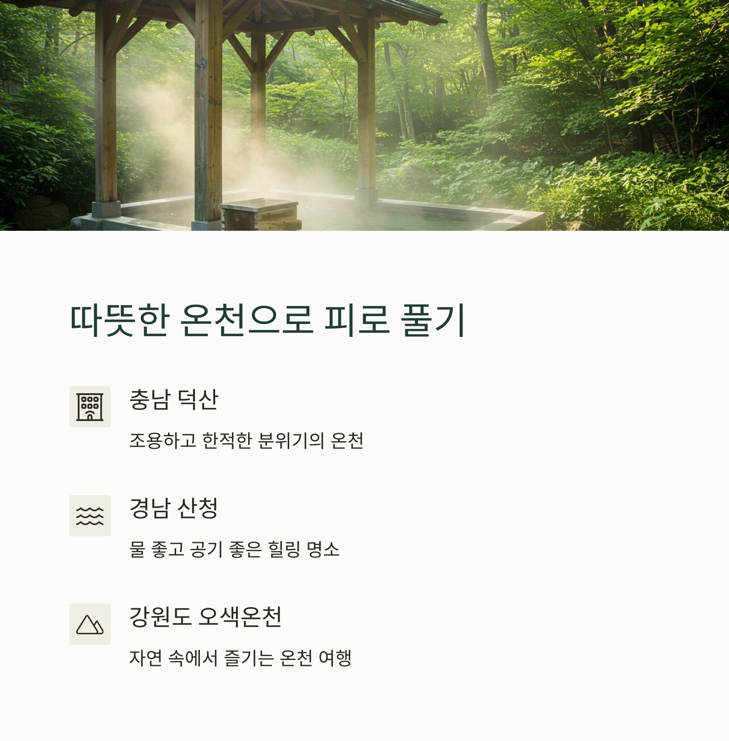 부모님이 제일 좋아하시는 게 뭘까 곰곰이 생각해보면요, 단연코 ‘따뜻한 물’이에요. 평소 허리나 무릎이 아프다고 하시는데, 온천은 그 자체로 치료예요. 국내에는 생각보다 다양한 온천 명소가 있어요. 특히 충남 덕산, 경남 산청, 강원도 오색온천 같은 곳은 조용하고 한적해서 부모님과 함께 가기에 딱이에요. 물 좋고 공기 좋고, 밥맛까지 기가 막히니 힐링이 절로 됩니다.