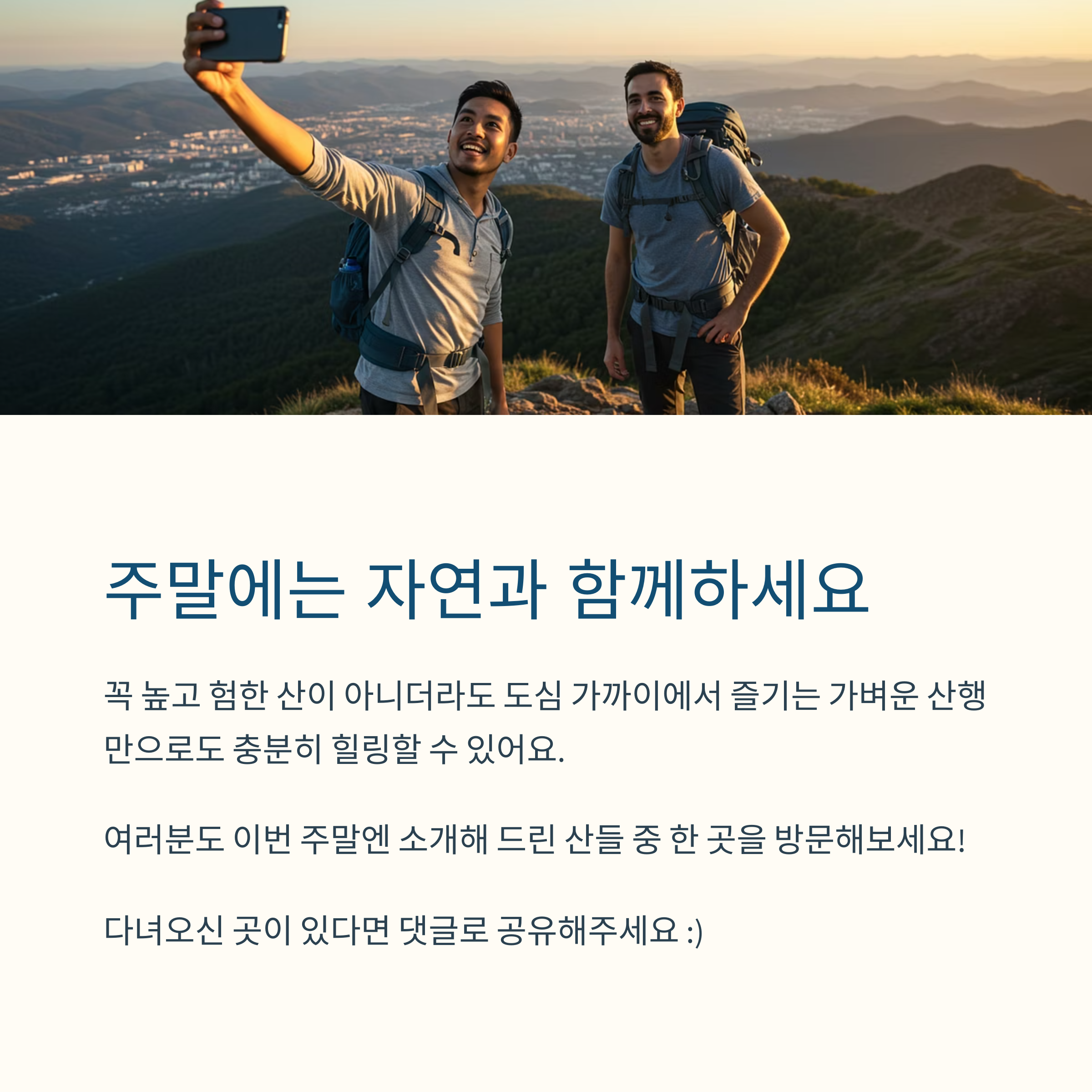 여러분, 오늘 소개해드린 국내 명산들 어떠셨나요? 꼭 높고 험한 산이 아니더라도 도심 가까이에서 즐기는 가벼운 산행만으로도 충분히 힐링할 수 있어요. 저도 바쁜 일상 속에서 잠깐이라도 숨 쉴 틈을 찾고 싶을 때마다 이런 산들을 찾곤 하거든요. 여러분도 이번 주말엔 도시를 벗어나 자연과 가까워지는 시간 가져보시길 바라요. 혹시 다녀오신 곳이 있다면 댓글로 공유해주시면 너무 반가울 것 같아요 :)