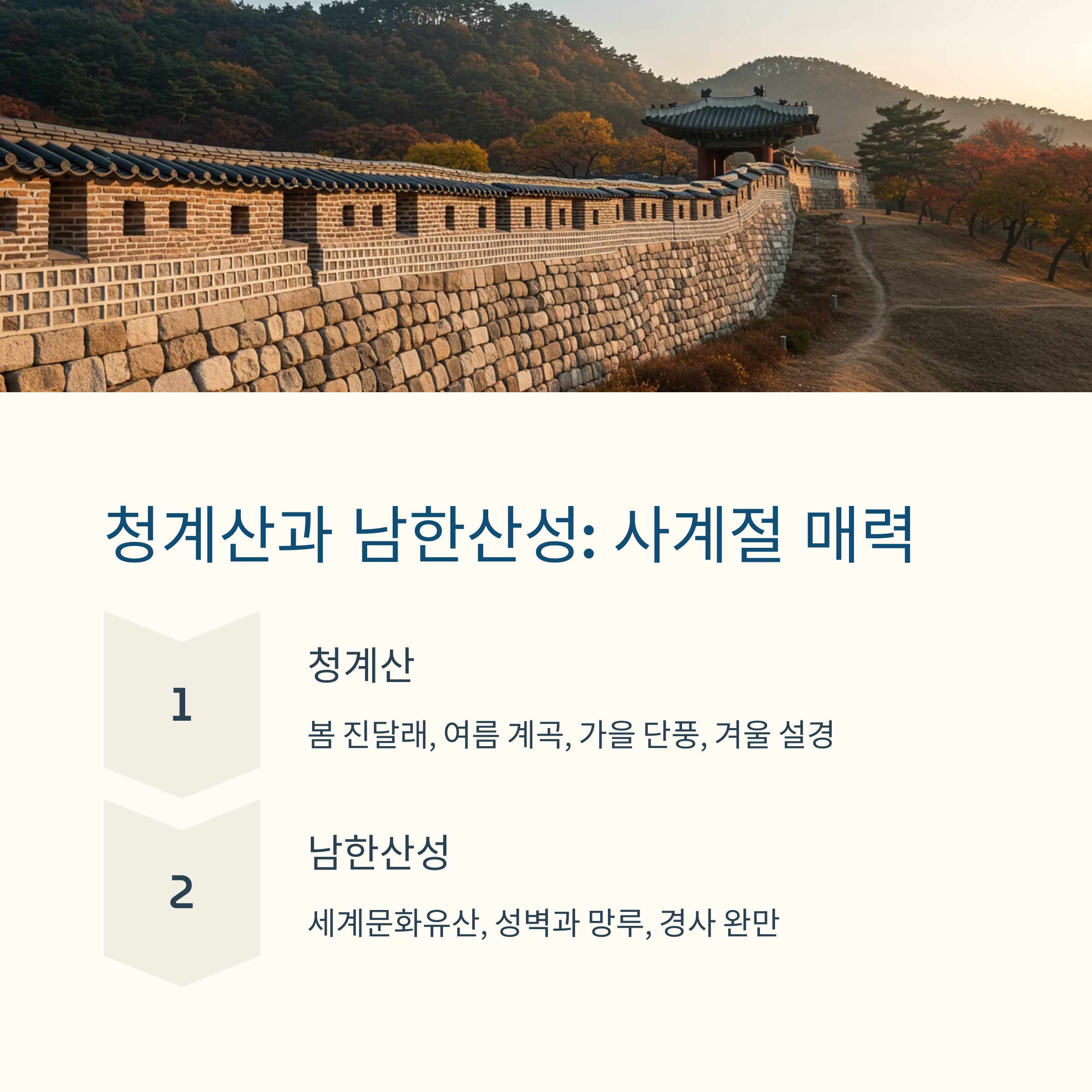 세계문화유산으로 지정된 남한산성은 단순한 산이라기보단 역사 유적지 느낌이 강한 곳이에요. 산책로를 따라 걷다 보면 성벽과 망루, 조선 시대 유적들을 곳곳에서 만날 수 있죠. 게다가 경사가 완만해서 가족 단위로 가기에도 좋고, 초보자도 무리 없이 다녀올 수 있어요.