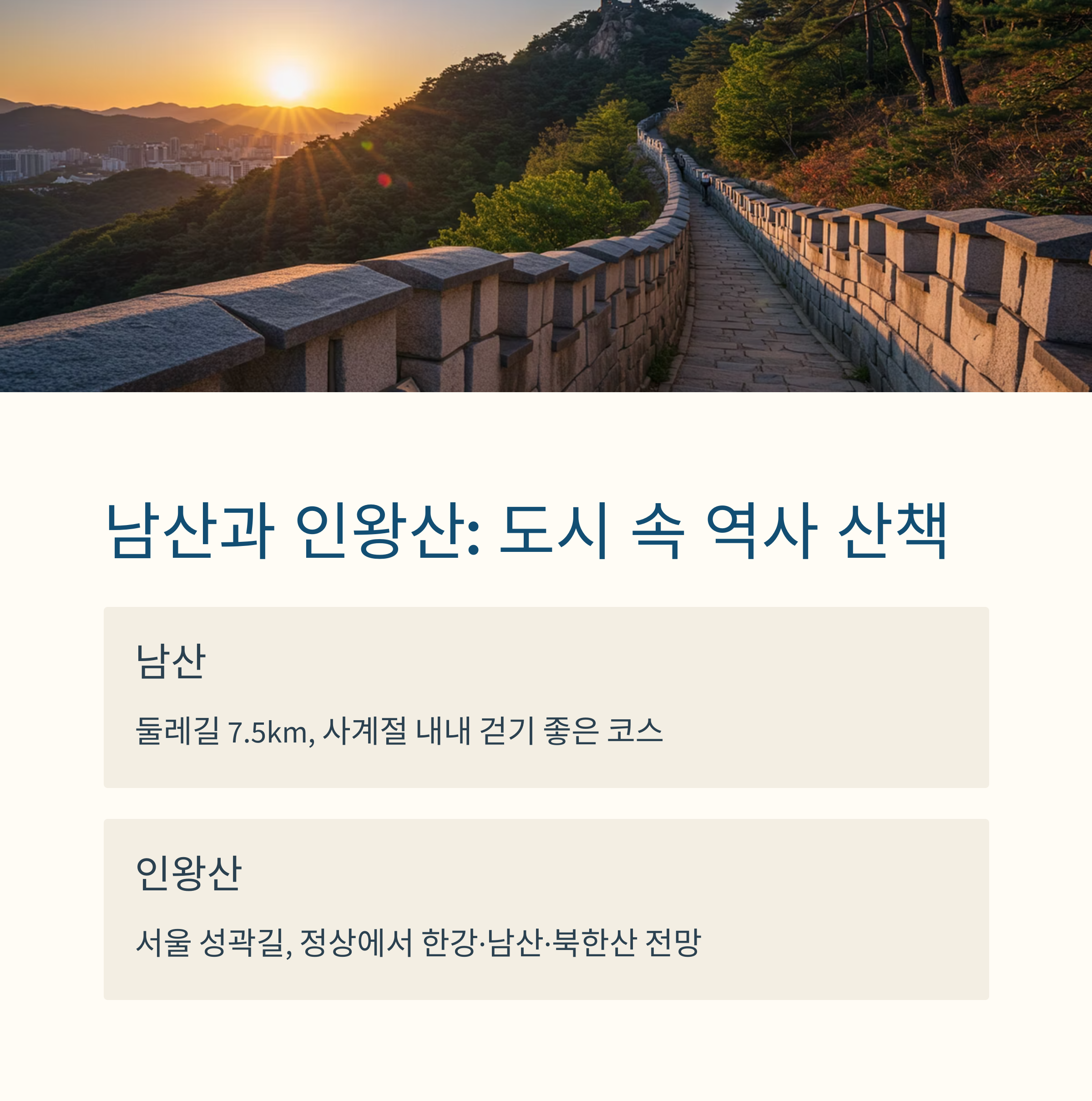 서울의 대표 랜드마크인 남산은 ‘산’이라기보단 ‘공원’ 같은 느낌이죠. 케이블카나 순환버스도 있지만, 직접 걸어 올라가면 더 특별한 경험이 돼요. 특히 남산 둘레길은 계절마다 색이 달라져서 사계절 내내 걷기 좋은 코스예요. 운동 겸 데이트 코스로도 많이 추천되는 이유가 있죠.