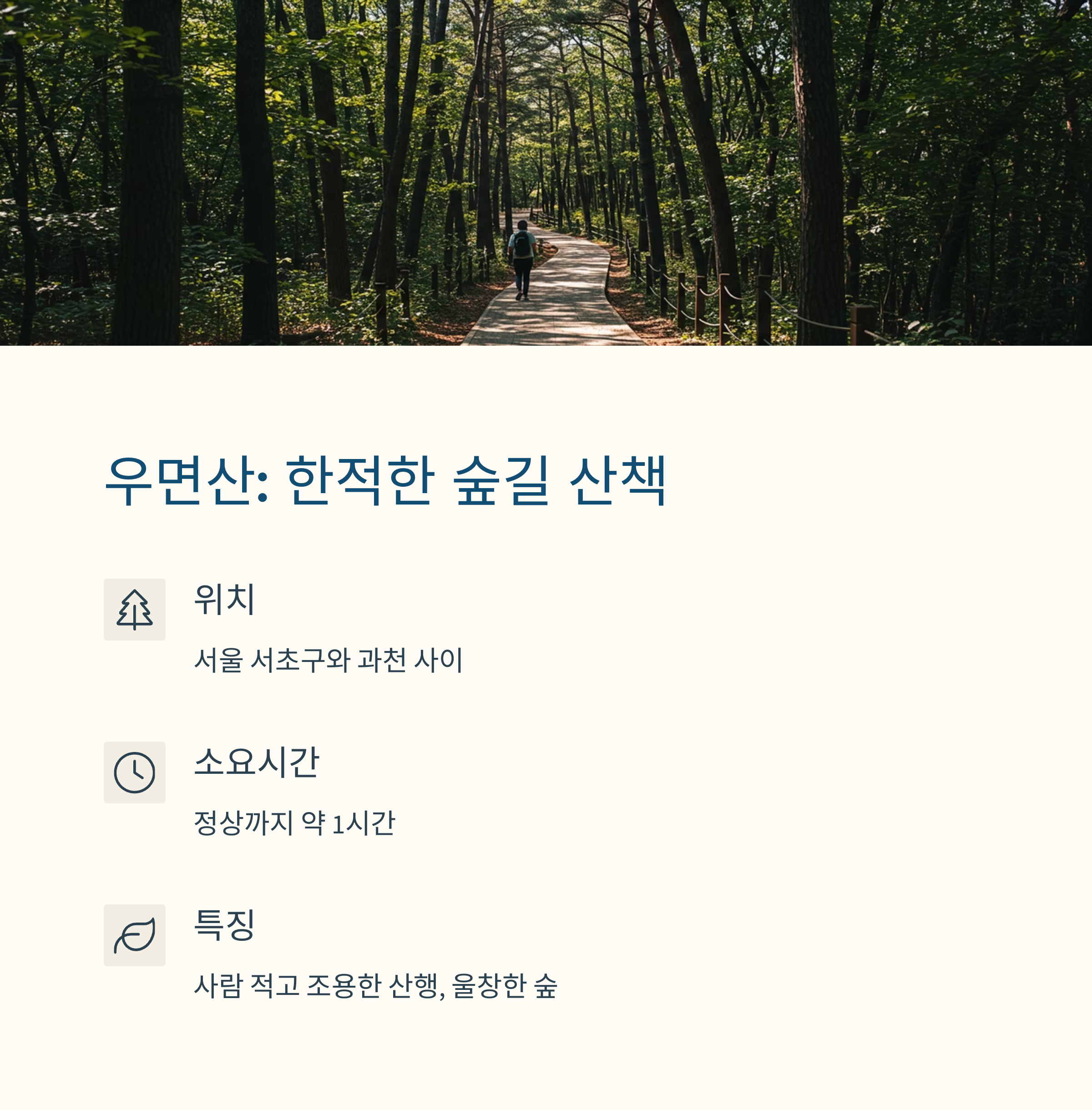 서울 서초구와 과천 사이에 있는 우면산은 비교적 덜 알려진 산이라 그런지 사람이 많지 않고 조용한 산행을 즐기기에 딱 좋은 곳이에요. 흙길도 잘 되어 있어서 무릎에 부담 없이 걸을 수 있고, 정상까지 오르는 데도 1시간이면 충분하답니다. 무엇보다 숲이 울창해서 한여름에도 그늘 아래 시원하게 걷기 좋아요. 산 중턱에는 작은 절도 있고, 쉼터도 잘 마련돼 있어서 중간중간 쉬기도 좋아요.