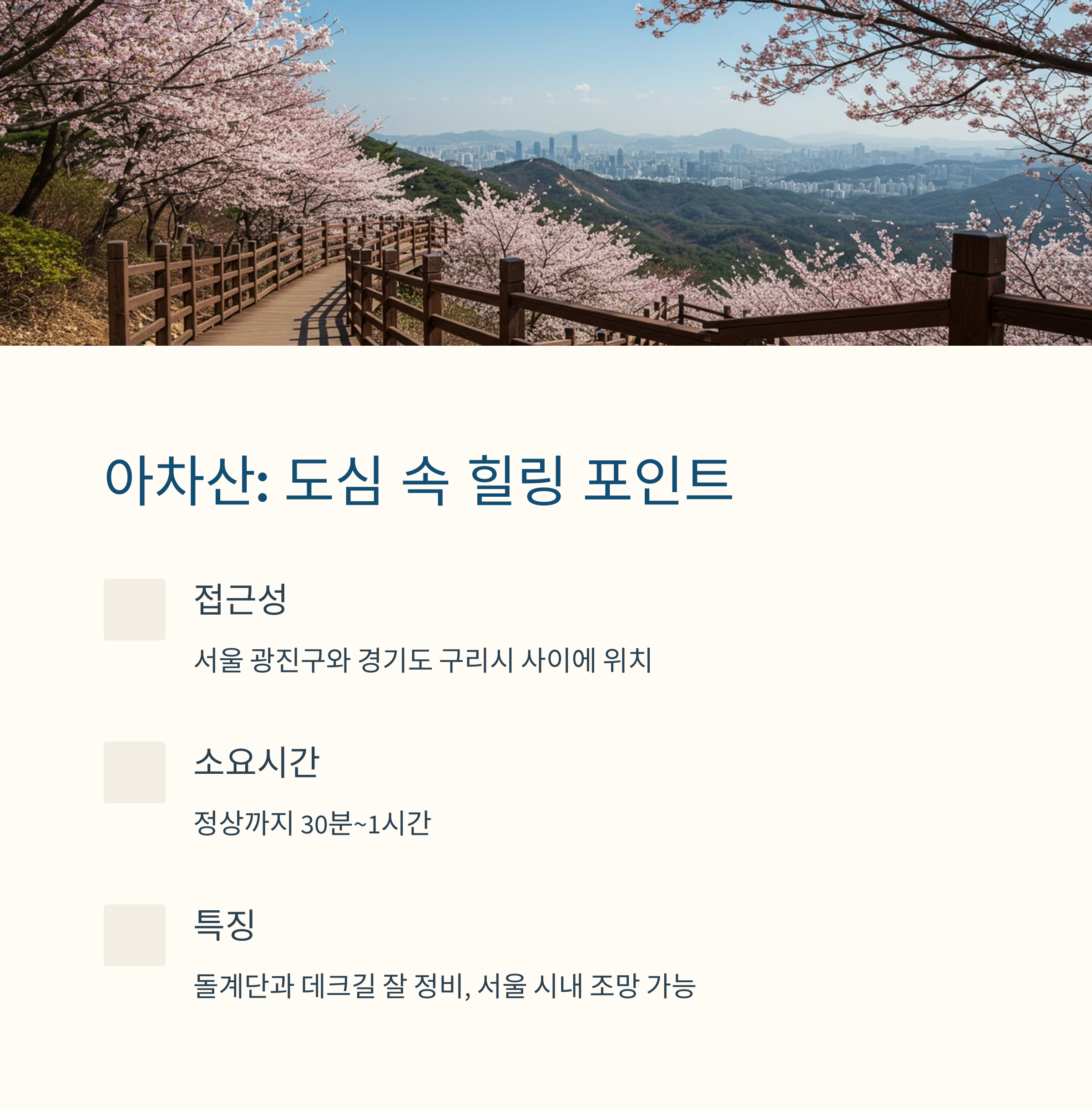 서울 광진구와 경기도 구리시 사이에 위치한 아차산은 정말 부담 없는 산행으로 딱 좋은 곳이에요. 정상까지 30분~1시간이면 오를 수 있고, 중간중간 서울 시내를 조망할 수 있는 포인트들이 있어서 사진 찍기에도 제격이죠. 돌계단과 데크길이 잘 정비돼 있어서 운동화만 신고도 충분히 오를 수 있답니다. 특히 봄철에는 진달래가 만발해서 산 전체가 분홍빛으로 물드는 모습, 정말 장관이에요!