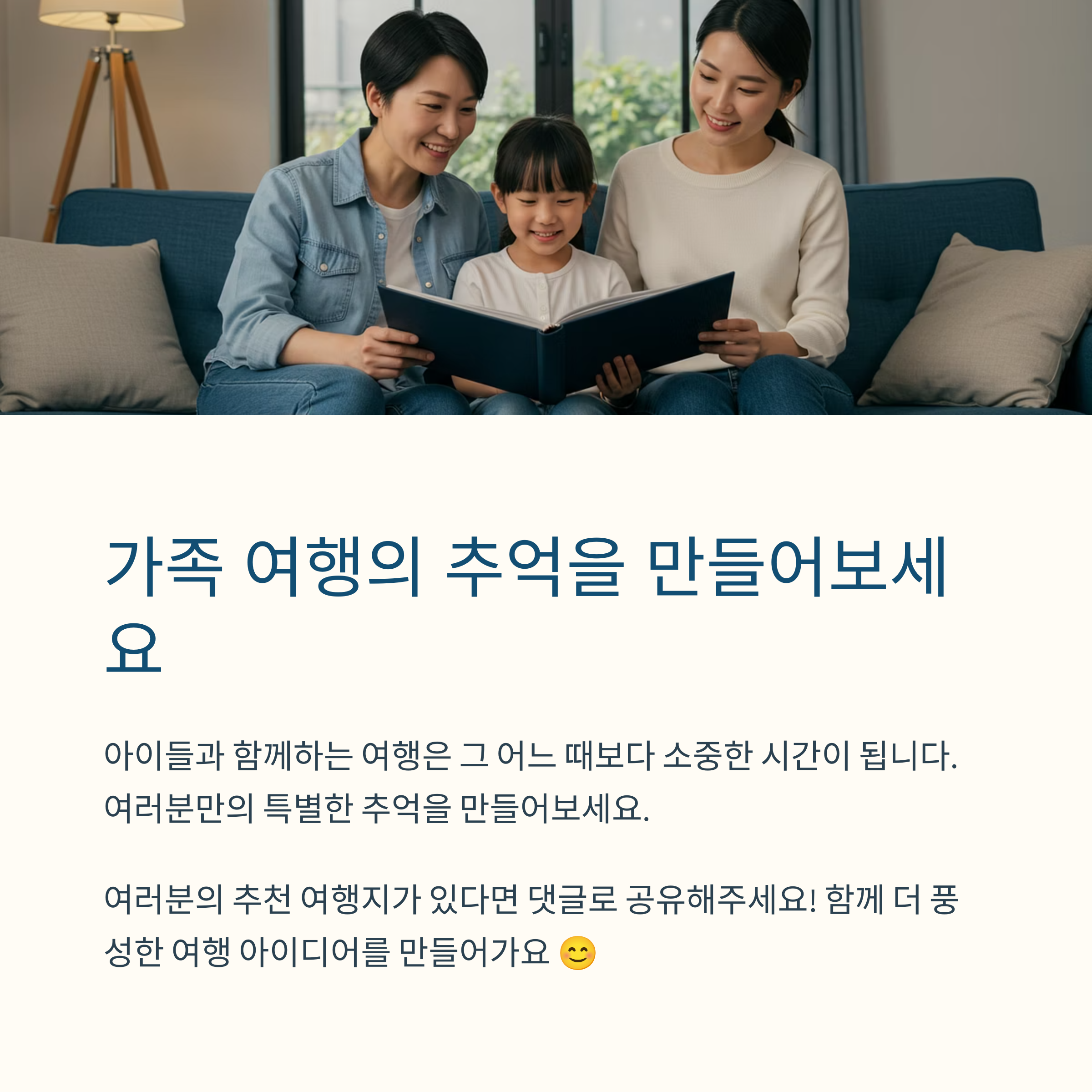 여행은 늘 우리에게 새로운 풍경과 기억을 선물해주죠. 특히 아이들과 함께하는 여행은, 그 어느 때보다도 소중한 시간이 됩니다. 오늘 소개한 국내 가족 여행지 중 하나라도 여러분의 추억이 담긴 장소가 되었으면 해요. 혹시 여러분만의 추천 여행지가 있다면 댓글로 공유해 주세요! 서로의 이야기를 나누며 더 풍성한 여행 아이디어를 함께 만들어가요 😊