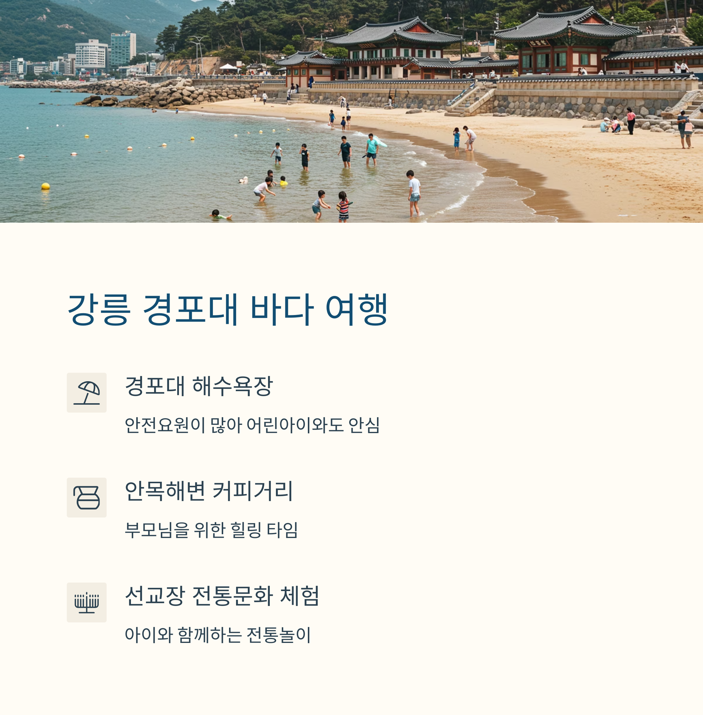 강릉은 바다와 문화가 조화를 이루는 가족 여행지로 최고예요. 특히 여름철엔 아이들과 함께 물놀이하며 뛰놀 수 있어서 인기 만점이죠. 아래는 강릉에서 꼭 가야 할 가족 여행 명소 리스트입니다.