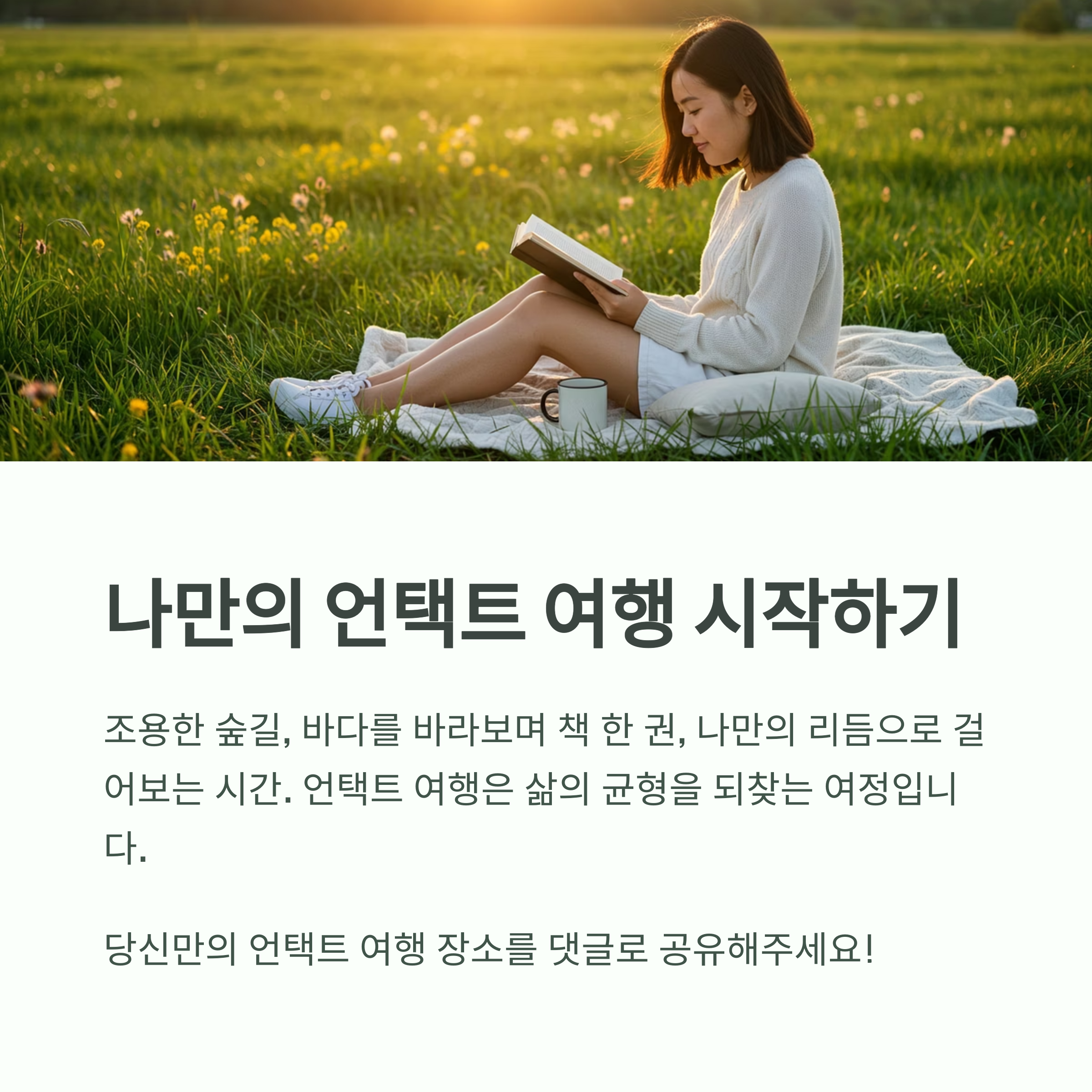 사람 많은 여행지에 지쳤다면, 이제는 '쉼'이 있는 여행을 해보는 건 어떨까요? 조용한 숲길, 바다를 바라보며 책 한 권, 나만의 리듬으로 걸어보는 시간. 언택트 여행은 단순한 트렌드가 아니라 삶의 균형을 되찾는 여정이 될 수 있어요. 오늘 소개한 장소와 팁들이 여러분의 여행에 작은 도움이 되었길 바랍니다. 다음 여행도 함께 준비해봐요!