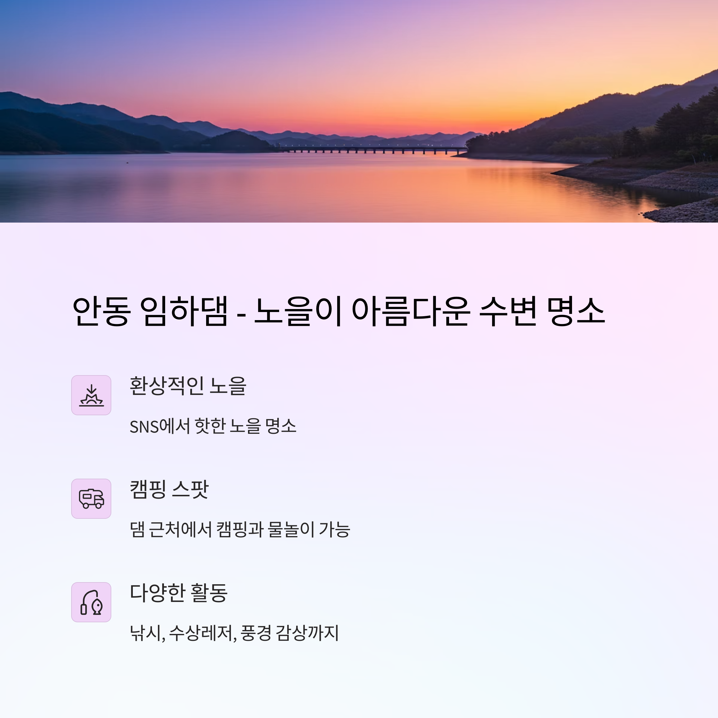 강이라고 하기엔 너무나도 잔잔하고, 호수라 하기엔 또 흐름이 있는 곳. 바로 안동 임하댐입니다. 이곳은 댐 근처에서 캠핑을 즐기며 물놀이도 가능하고, 무엇보다 저녁 노을이 진짜 예술이에요. 도심과 가까운 거리도 아닌데도 불구하고 SNS에서 핫하게 떠오른 이유가 있죠. 낚시, 수상레저, 풍경 감상까지 모두 가능한 복합 힐링 스팟이에요.