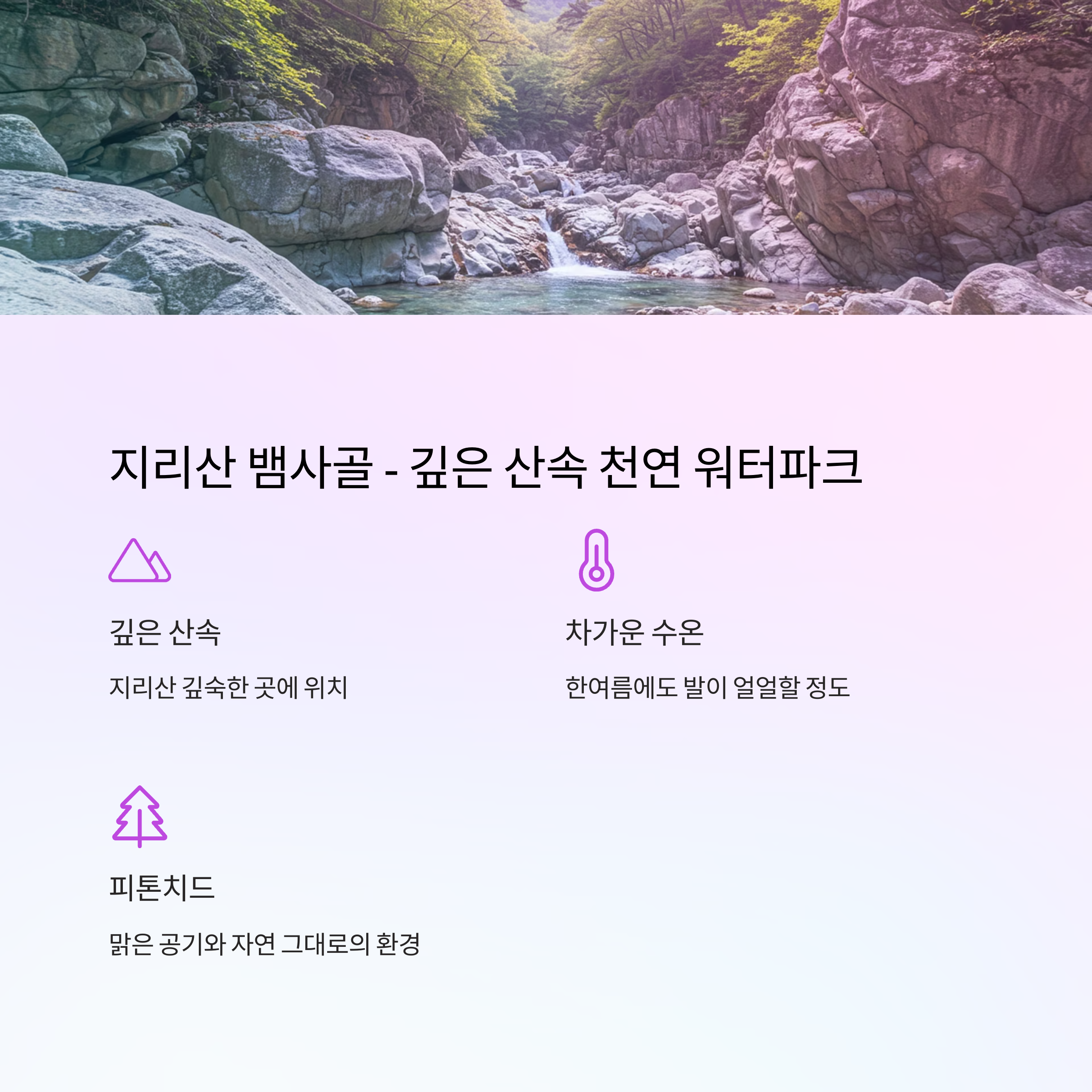 뱀사골은 이름부터 강렬하지만, 실제로는 그보다 훨씬 더 아름다운 자연을 품고 있어요. 지리산 깊숙한 곳에 위치해 있어서 공기도 맑고 물은 차갑고 깨끗합니다. 한여름에도 물에 발을 담그면 다리부터 얼얼한 청량함이 전해질 정도! 등산 후 피톤치드 샤워와 시원한 물놀이를 동시에 즐기고 싶다면 이곳을 추천합니다.