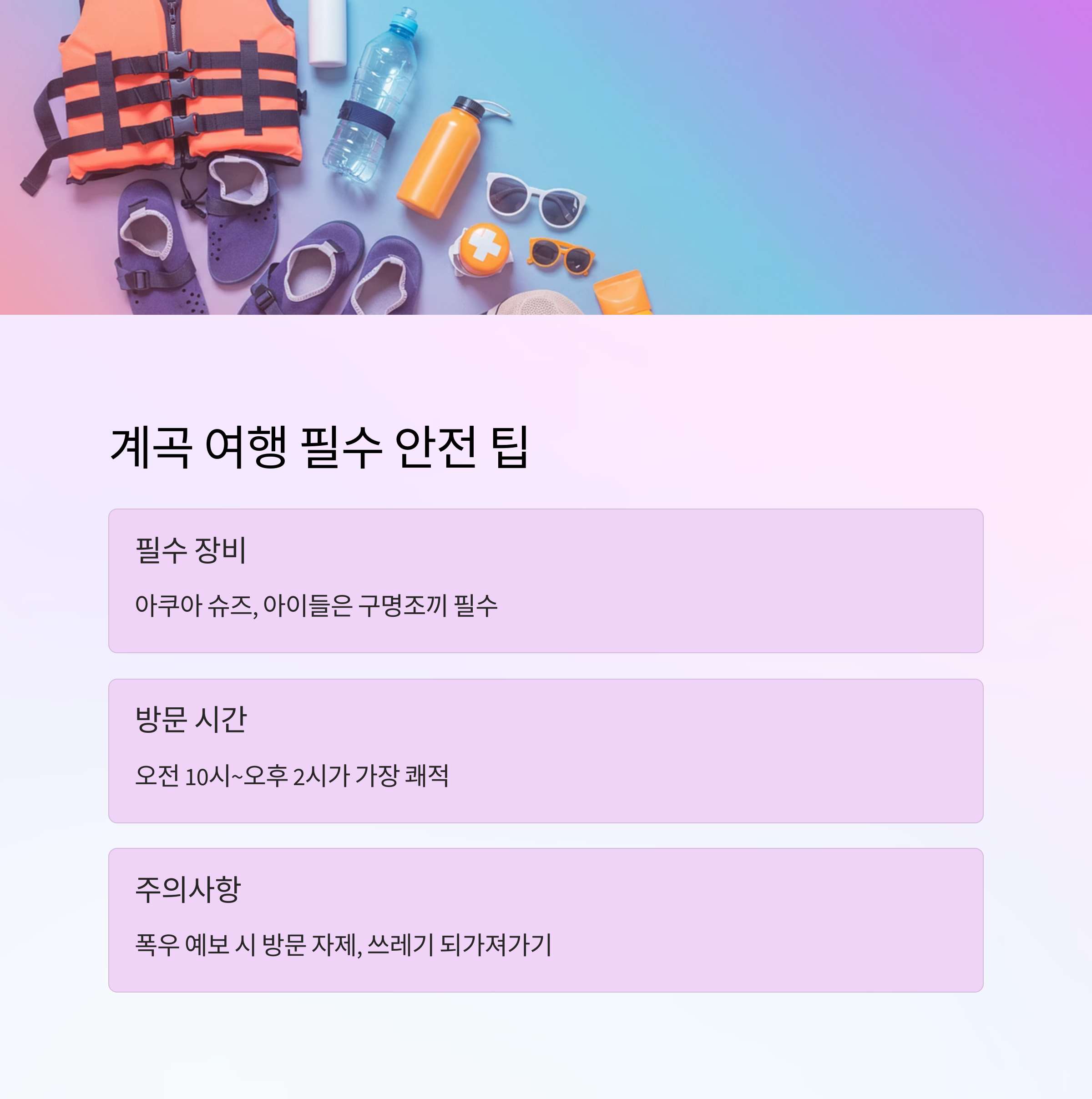 계곡 여행은 시원하고 즐겁지만, 안전이 가장 중요해요. 물 깊이가 갑자기 깊어질 수 있고, 바위가 미끄럽기 때문에 방심은 금물입니다. 아래 리스트에 간단히 정리해드릴게요.