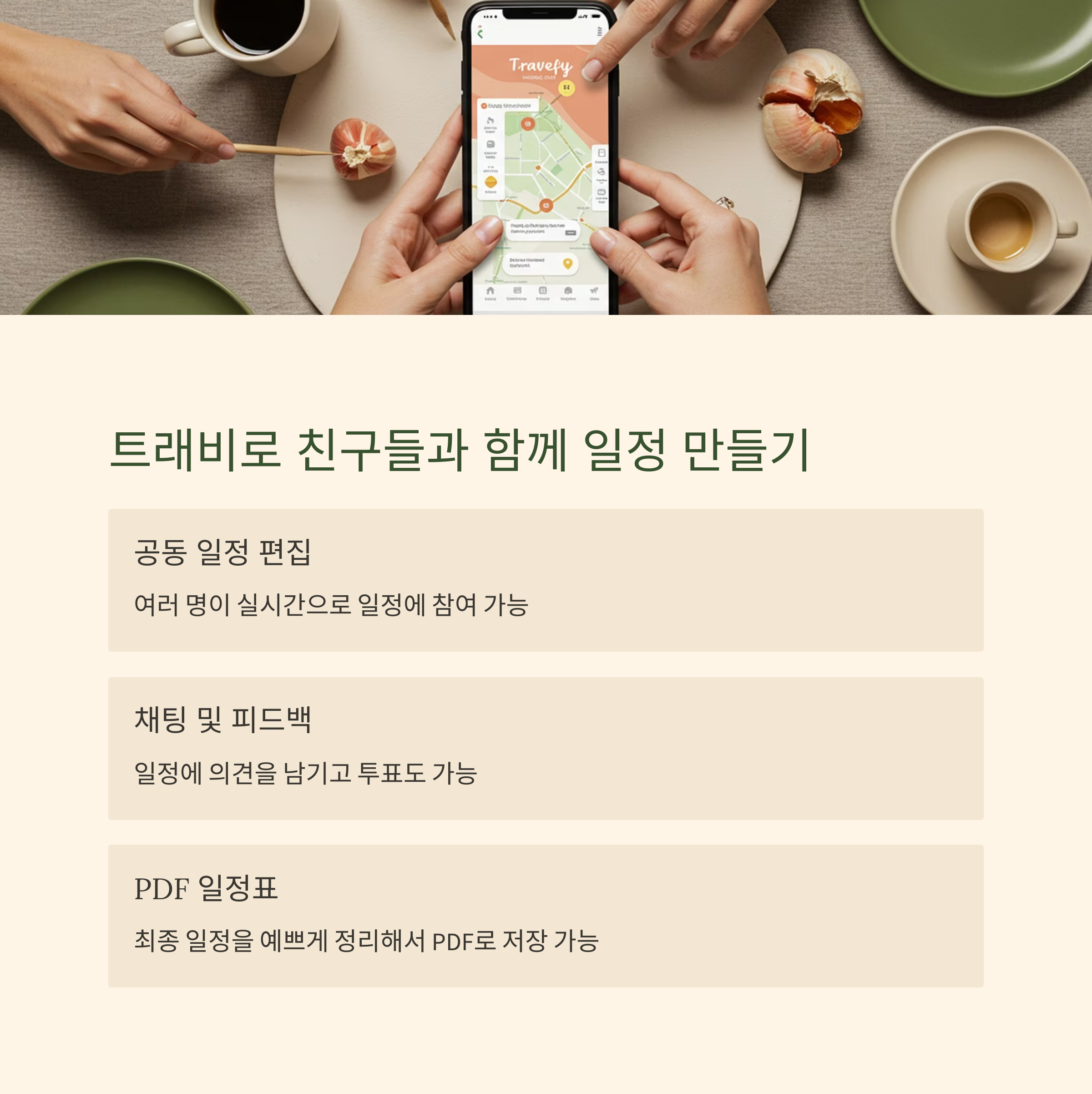 친구들이랑 여행 갈 때 가장 어려운 게 뭔지 아세요? 일정 맞추기예요. 근데 Travefy는 다 같이 일정을 편집하고 댓글로 의견 나눌 수 있어서 진짜 팀플 느낌 나요. 누구는 맛집, 누구는 카페 찾고, 각각 추가해 놓으면 앱이 알아서 통합해줘요.