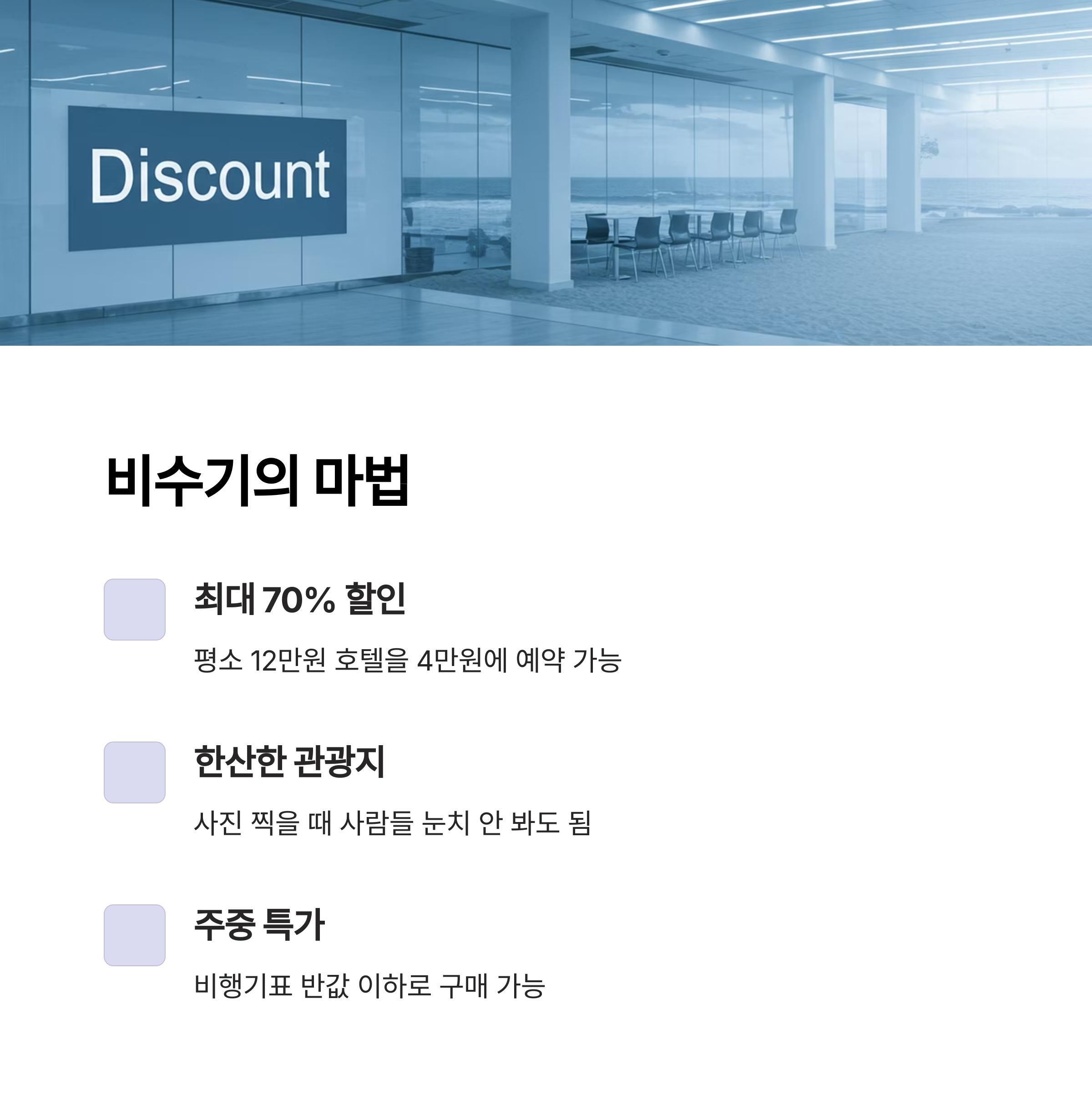 | 비행기 | 항공사 특가, 얼리버드 요금 | 최대 70% |