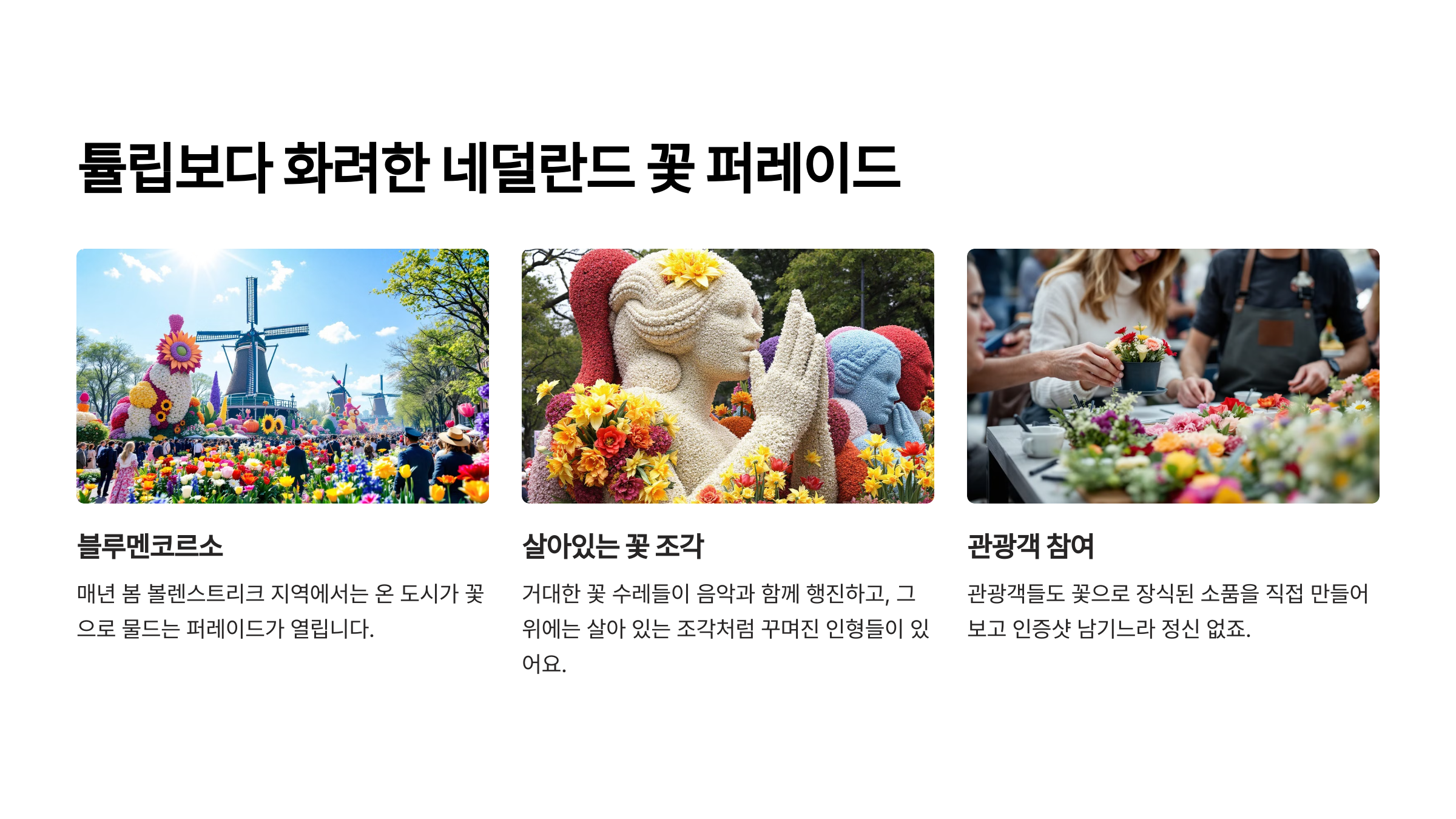 네덜란드 하면 다들 튤립부터 떠올리시죠? 근데요, 진짜는 따로 있어요. 매년 봄이 오면 볼렌스트리크 지역에서는 온 도시가 꽃으로 물드는 블루멘코르소(꽃 퍼레이드)가 열립니다. 거대한 꽃 수레들이 음악과 함께 행진하고, 그 위에는 살아 있는 조각처럼 꾸며진 인형들이 타고 있어요. 너무 정교해서 진짜 살아 움직이는 줄 알았을 정도였어요. 관광객들도 꽃으로 장식된 소품을 직접 만들어보고 인증샷 남기느라 정신 없죠. 봄을 전신으로 느끼고 싶은 분이라면 꼭 추천해요.