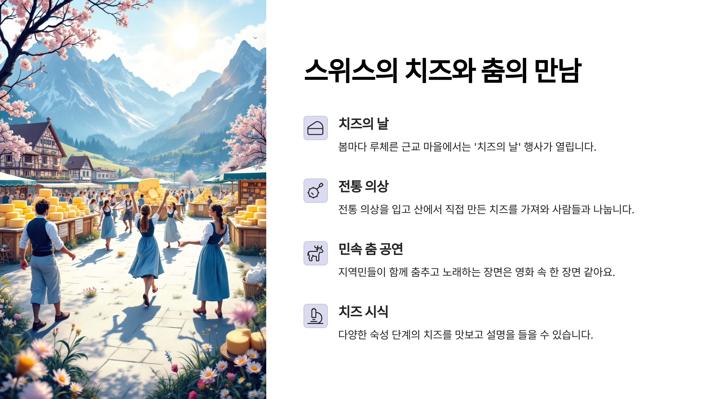 치즈를 진짜로 축제의 주인공으로 삼은 나라, 어디일까요? 바로 스위스예요. 봄마다 루체른 근교 마을에서는 ‘치즈의 날’이라는 행사가 열리는데, 이게 또 별미입니다. 전통 의상을 입고 산에서 직접 만든 치즈를 가져와 사람들과 나누고, 거기다 지역민들이 함께 춤추고 노래하는 장면은 영화 속 한 장면 같아요.