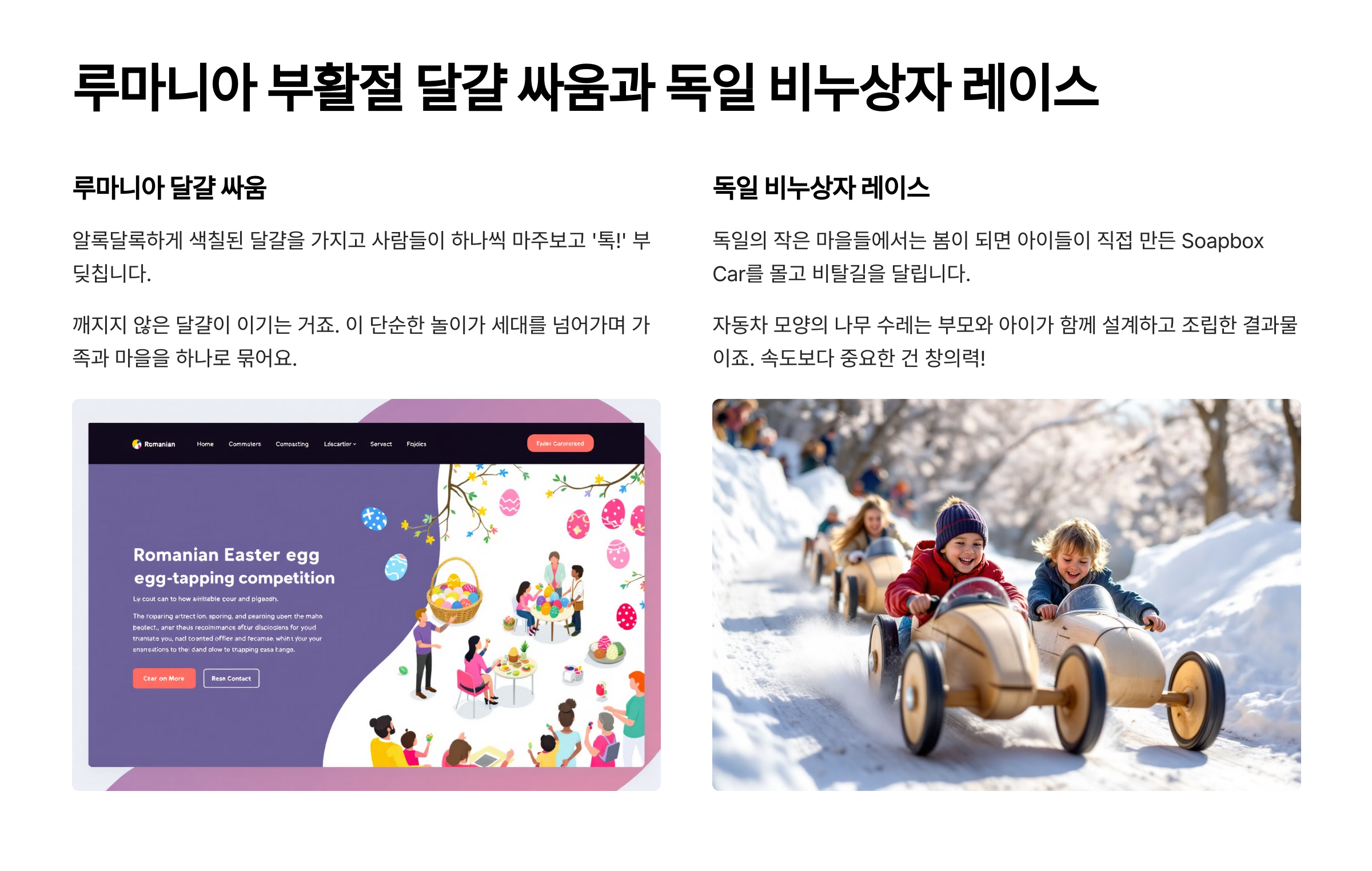루마니아의 부활절, 그냥 달걀을 먹는 수준이 아니에요. 달걀 깨기 대결이라는 문화가 존재하거든요. 축제가 열리는 날, 알록달록하게 색칠된 달걀을 가지고 사람들이 하나씩 마주보고 ‘톡!’ 부딪칩니다. 깨지지 않은 달걀이 이기는 거죠. 이 단순한 놀이가 세대를 넘어가며 가족과 마을을 하나로 묶어요.
