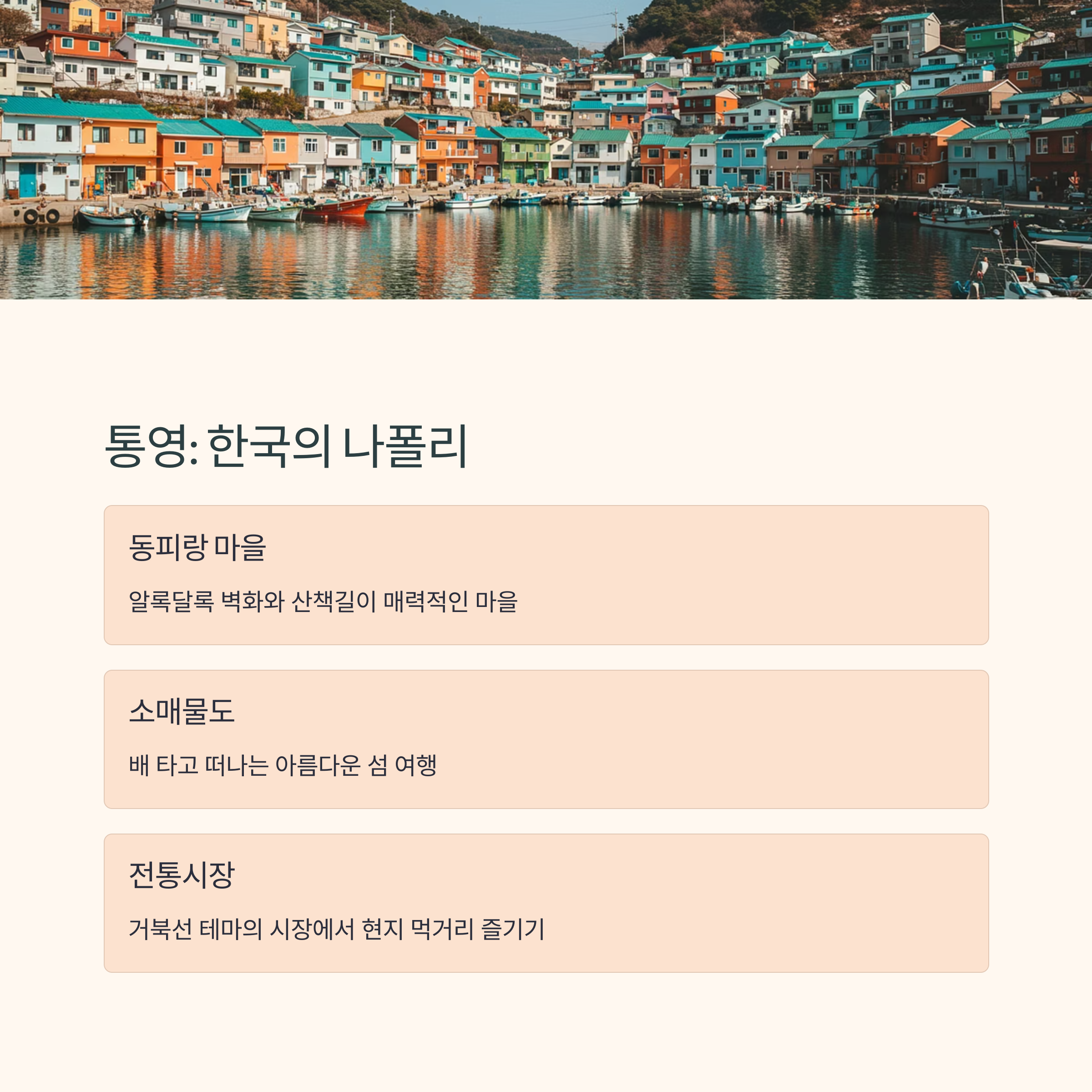 '한국의 나폴리'라 불리는 통영은 바다, 섬, 미술, 그리고 먹거리까지 다 갖춘 곳이에요. 윤이상 기념관부터 동피랑 벽화마을, 그리고 거북선 테마의 전통시장까지 다채로운 재미가 가득하죠. 특히 섬 여행 좋아하시는 분들에겐 소매물도 투어가 완전 강추입니다.