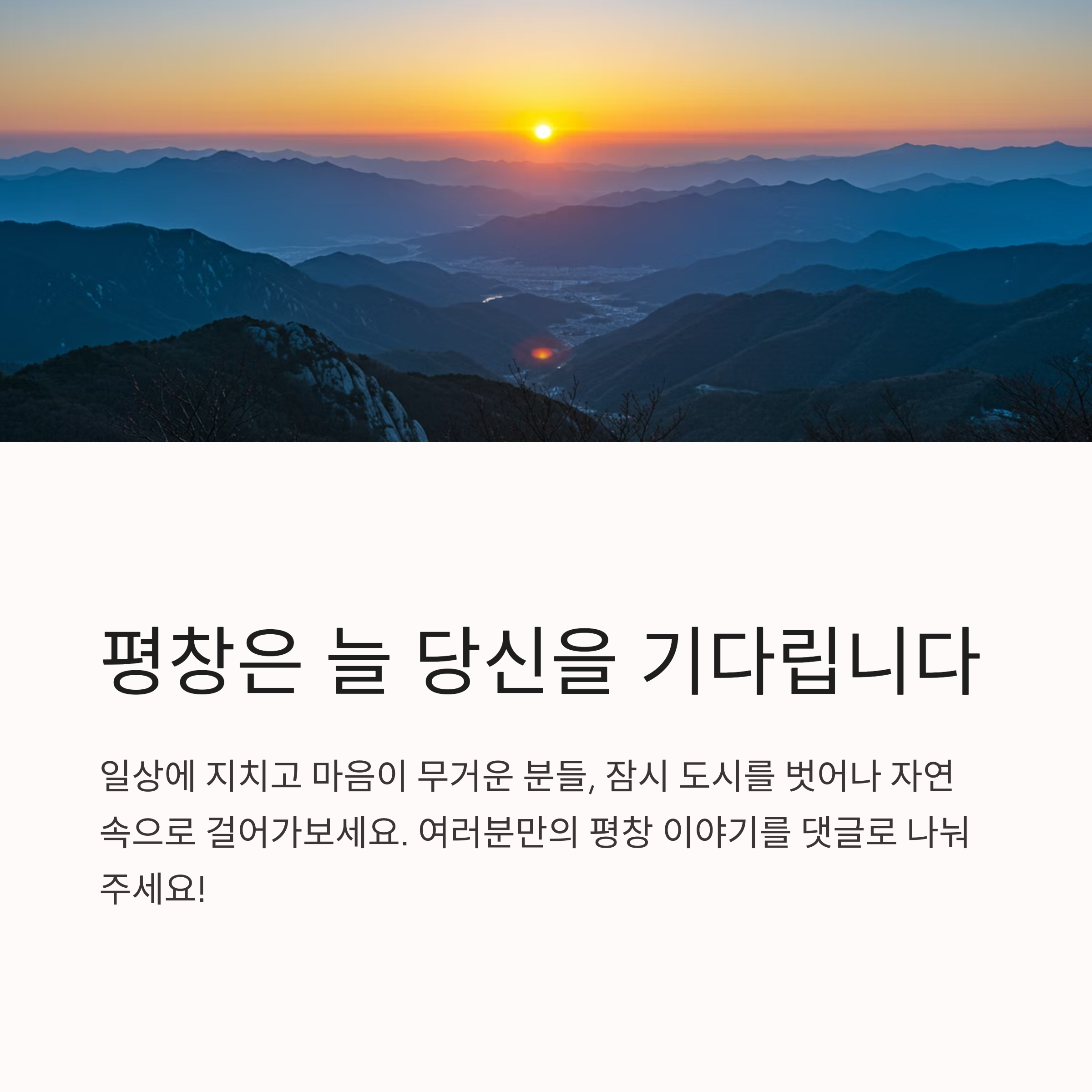 이 글을 쓰며 다시 떠올린 평창의 숲과 계곡, 그 공기와 소리들이 벌써 그리워지네요. 혹시 요즘 일상에 지치고 마음이 무거운 분들이 있다면, 잠시 도시를 벗어나 자연 속으로 걸어가보는 건 어떨까요? 평창은 늘 그 자리에, 조용히 우리를 기다리고 있답니다. 혹시 다녀오셨거나, 또 다른 숨은 명소 알고 계신다면 댓글로 나눠주세요! 여행은 함께할수록 더 깊어지니까요 :)