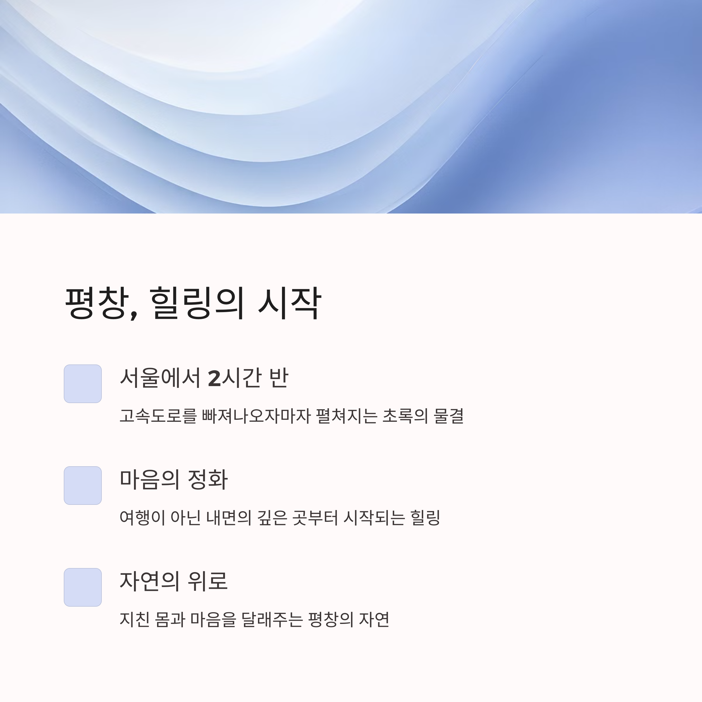 사실 처음엔 그냥 좀 쉬고 싶다는 마음이었어요. 아무것도 하지 않고, 그냥 멍하니 있고 싶은 그런 날들. 그럴 때 친구가 그러더라구요. "그럴 땐 평창이지!" 그래서 짐을 싸서 바로 떠났죠. 서울에서 차로 약 2시간 반. 고속도로를 빠져나오자마자 펼쳐지는 초록의 물결에 벌써부터 숨이 트이는 느낌이었어요. 여행이 아니라, 마음속 깊은 곳에서부터 정화가 시작되는 듯한 기분이랄까.