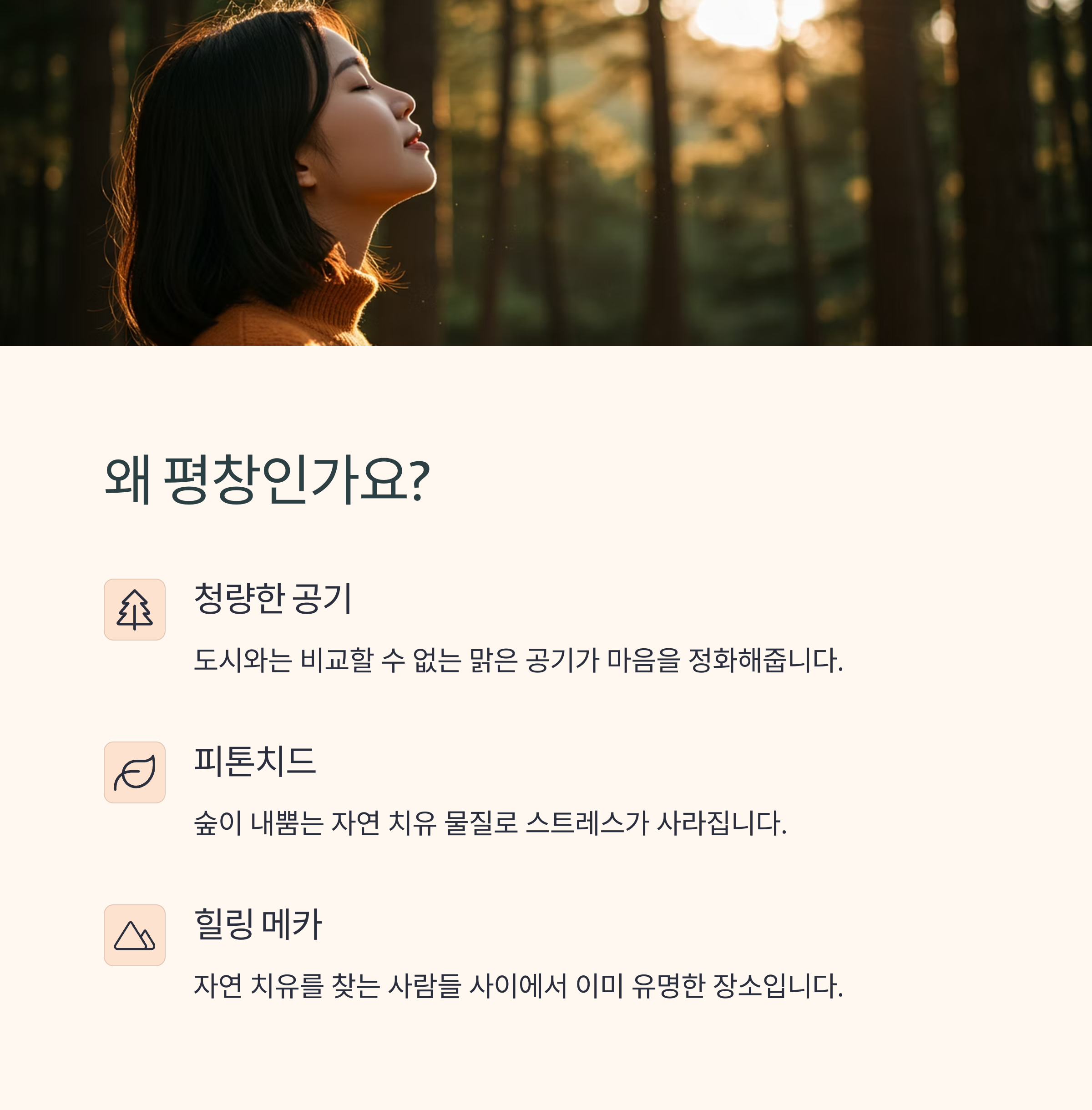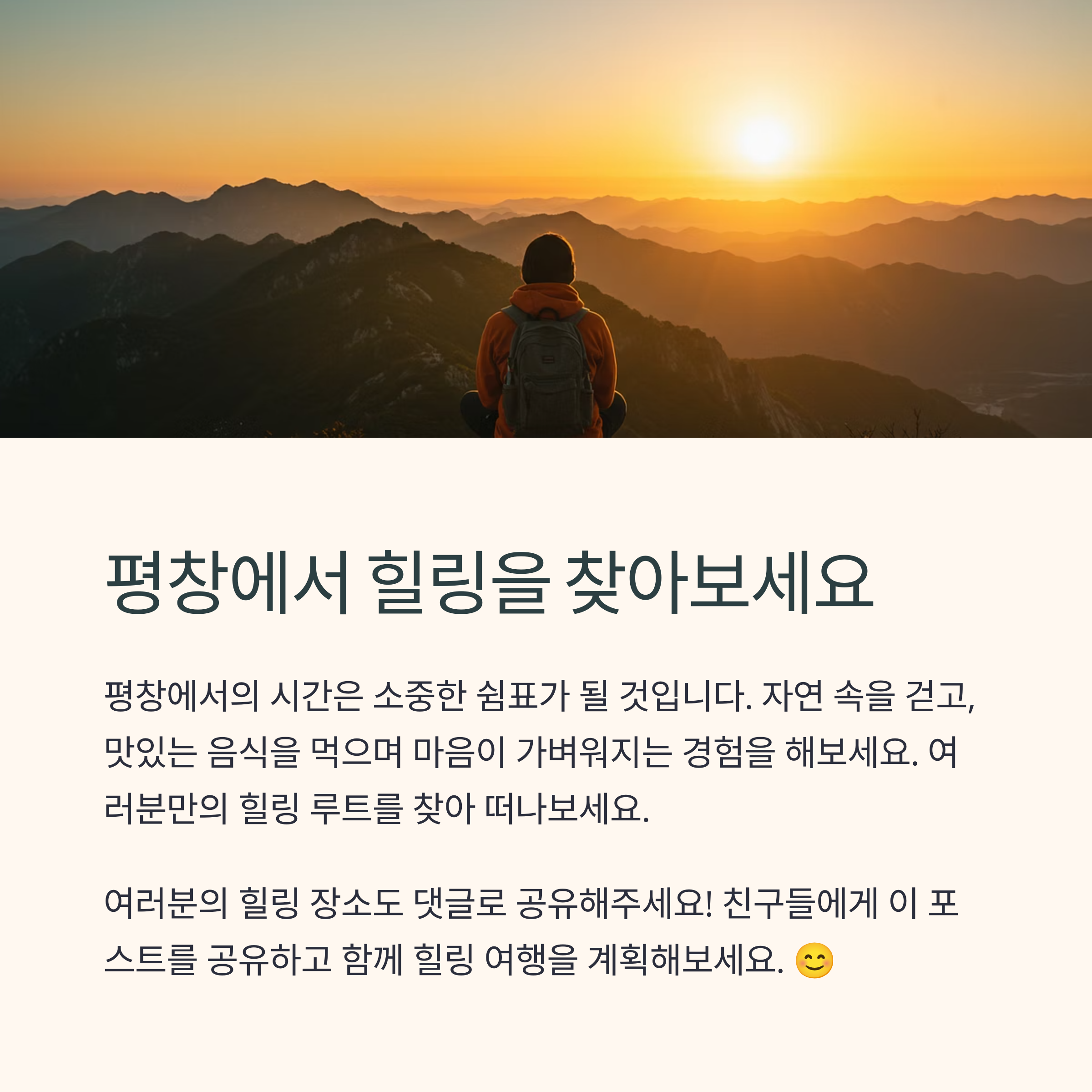 안녕하세요 여러분! 저는 며칠 전 평창으로 아주 특별한 여행을 다녀왔어요. 솔직히 말하면, 요즘 마음이 너무 복잡하고 머리도 무겁더라구요. 그래서 '잠깐이라도 도망치고 싶다'는 생각에 가방 하나 메고 평창으로 향했죠. 자연은 참 신기해요. 그냥 걷기만 했는데도 어깨가 조금씩 풀리고, 숨이 쉬어졌거든요. 오늘은 제가 직접 걸어본 평창의 힐링 루트를 공유해보려고 해요. 혹시 여러분도 일상에 쉼표가 필요하셨다면, 이 글이 도움이 될지도 몰라요.