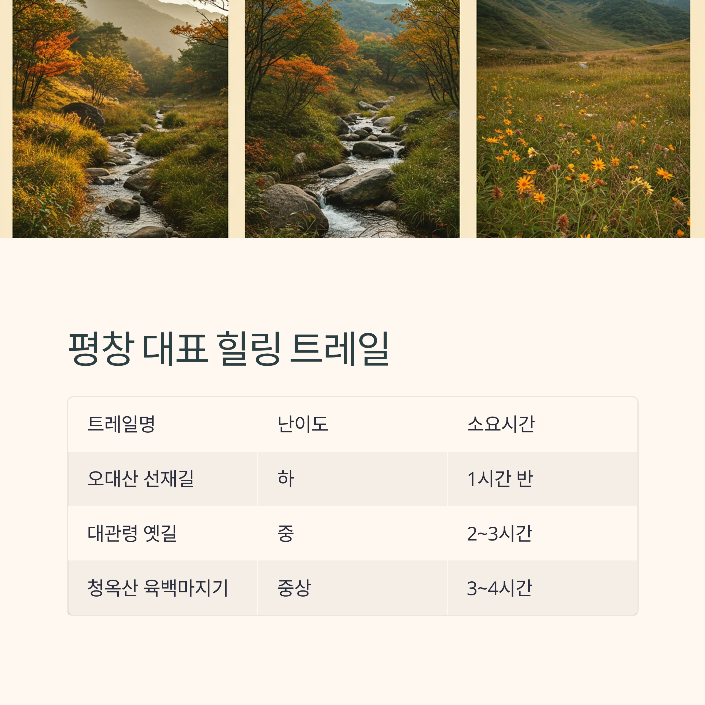 | 대관령 옛길 | 중 | 2~3시간 | 역사적 흔적과 풍경이 공존 |