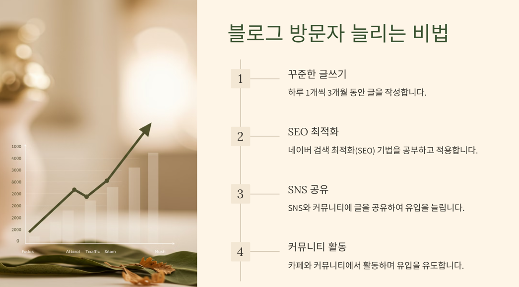 💡 Tip: "처음 3개월은 방문자가 없어도 꾸준히! 6개월 차부터 수익이 보이기 시작해요!"