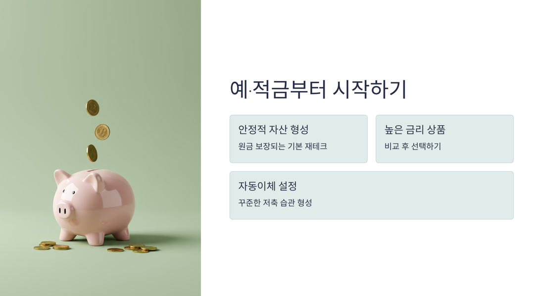재테크의 기본은 안정적인 자산 형성입니다. 은행 예금과 적금은 원금 보장이 되며, 초보자가 쉽게 접근할 수 있는 방법이에요. 금리가 높은 상품을 찾아보고 자동이체를 설정해보세요.